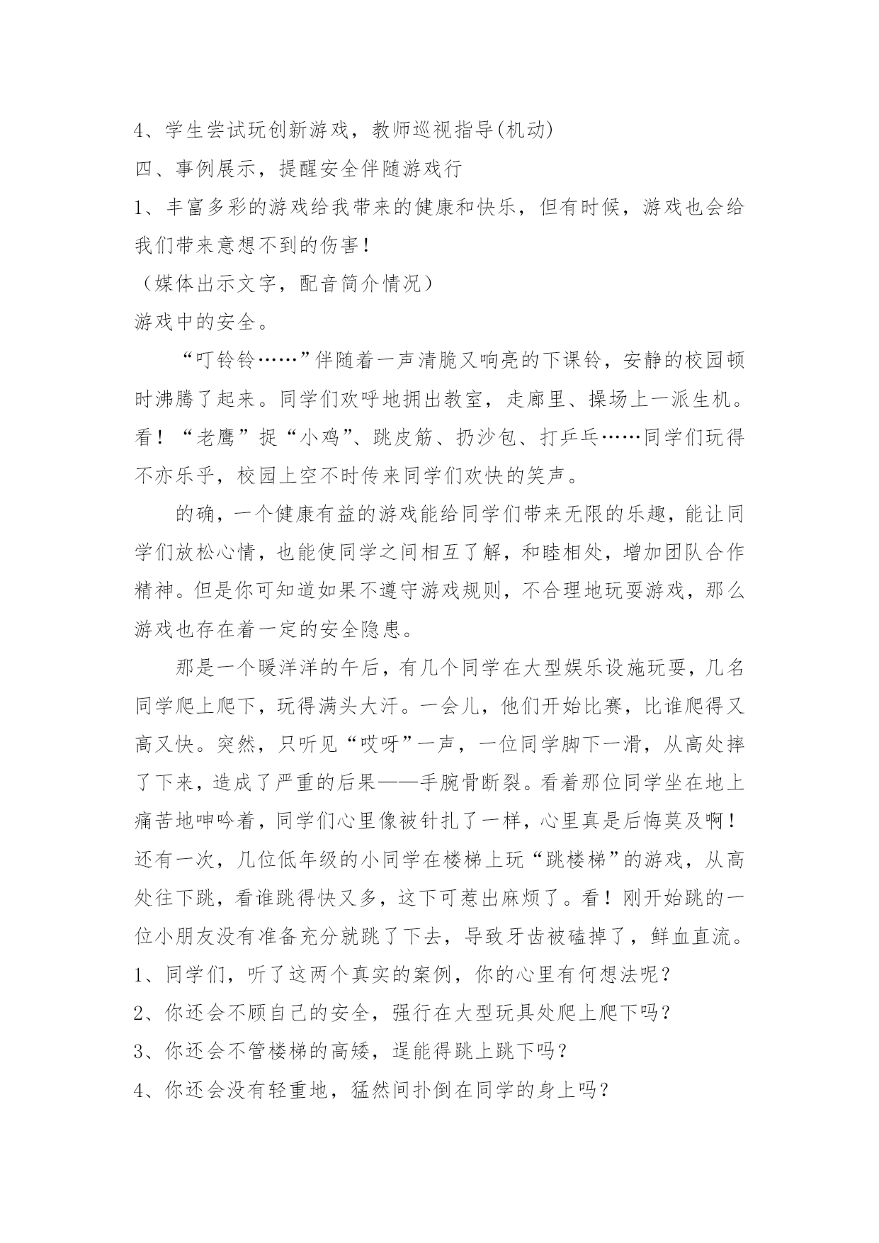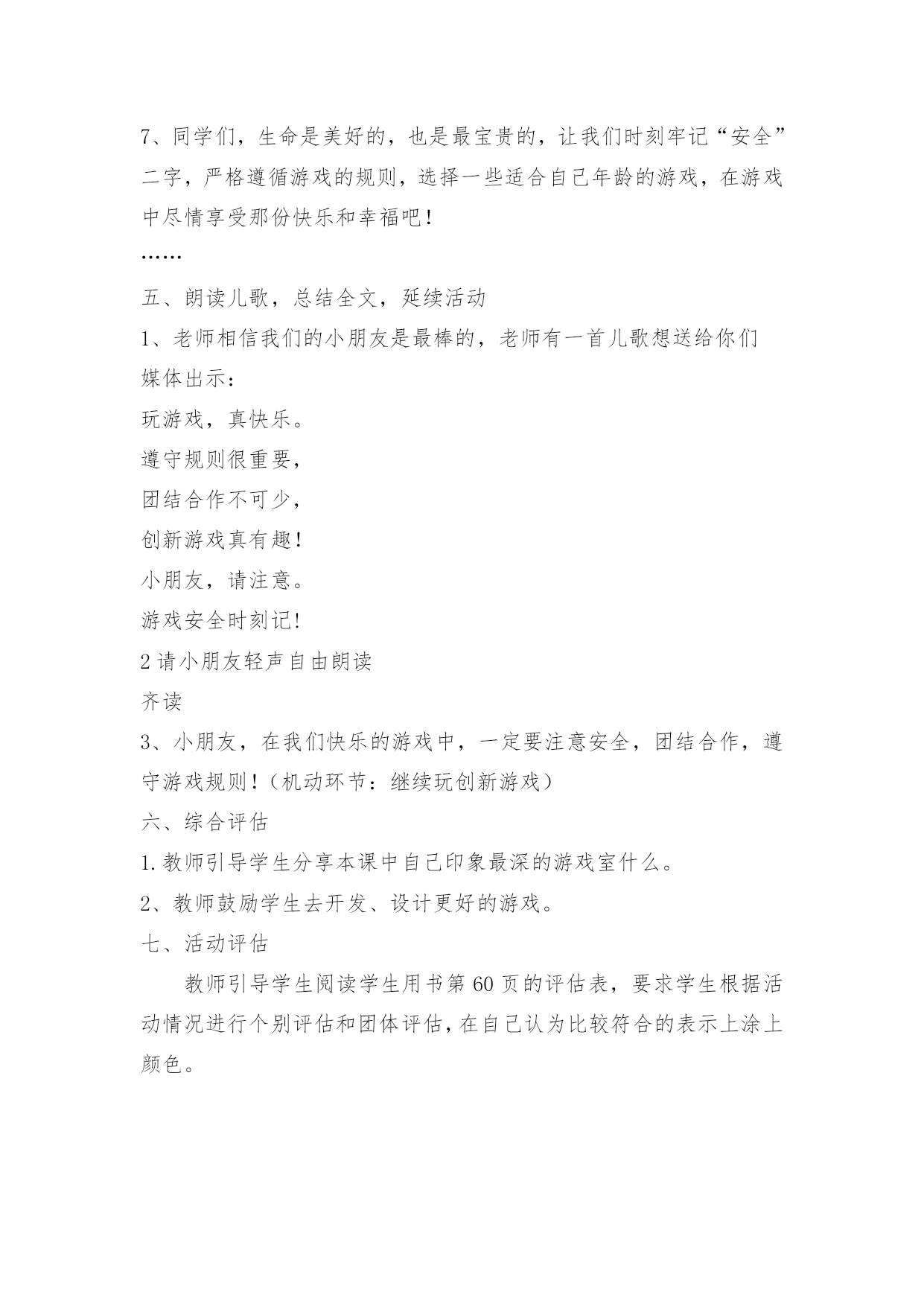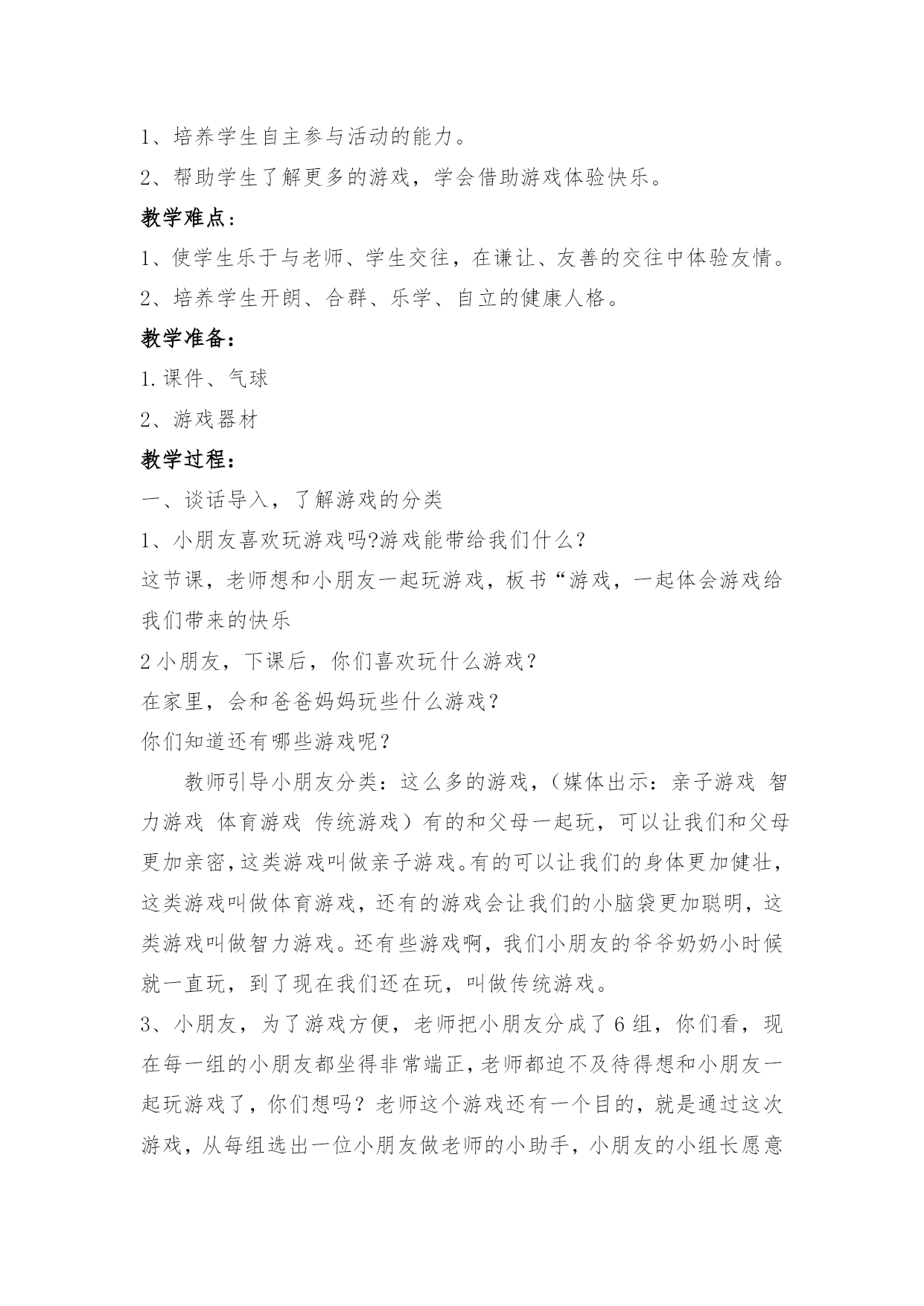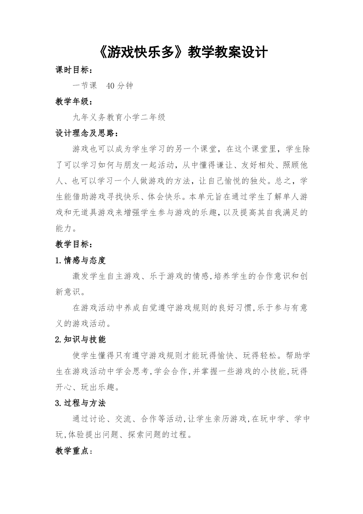 《游戏快乐多》教学教案设计九年义务教育小学二年级和静县第一小学综合组:李妍《游戏快乐多》教学教案设计教学年级:九年义务教育小学二年级设计理念:游戏也可以成为学生学习的另一个课堂,在这个课堂里,学生除了可以学习如何与朋友一起活动,从中懂得谦让、友好相处、照顾他人、也可以学习一个人做游戏的方法,让自己愉悦的独处。总之,学生能借助游戏寻找快乐、体会快乐。本单元旨在通过学生了解单人游戏盒无道具游戏来增强学生参与游戏的乐趣,以及提高其自我满足的能力。教学目标:1.情感与态度激发学生自主游戏、乐于游戏的情感,培养学生