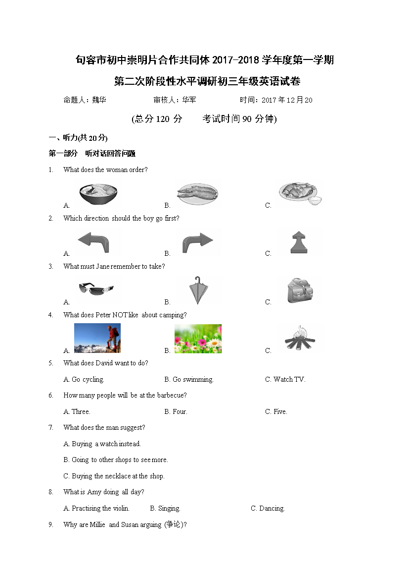 句容市初中崇明片合作共同体2017-2018学年度第一学期第二次阶段性水平调研初三年级英语试卷命题人:魏华审核人:华军时间:2017年12月20(总分120分考试时间90分钟)一、听力(共20分)第一部分听对话回答问题1.Whatdoesthewomanorder?A.B.C.2.Whichdirectionshouldtheboygofirst?A.B.C.3.WhatmustJaneremembertotake?A.B.C.4.WhatdoesPeterNOTlikeaboutcamping?A.B.