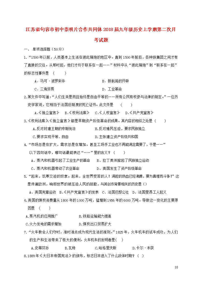 10江苏省句容市初中崇明片合作共同体2018届九年级历史上学期第二次月考试题单项选择题(50分)1.“1500年以前,人类基本上生活在彼此隔绝的地区中。直到1500年前后,各种族集团之间才有了直接的交往。从那时起,他们才终于联系在一起……”材料中从“彼此隔绝”到“联系在一起”的标志性事件是()A.马可·波罗来华B.新航路的开辟C.三角贸易D.工业革命2.某文件中写道:“人们生来是而且始终是自由平等的……所有公民有权参与法律的制定。”一位历史学家说,它相当于法国旧制度的死亡证书。此文件是()A.《独立宣言》