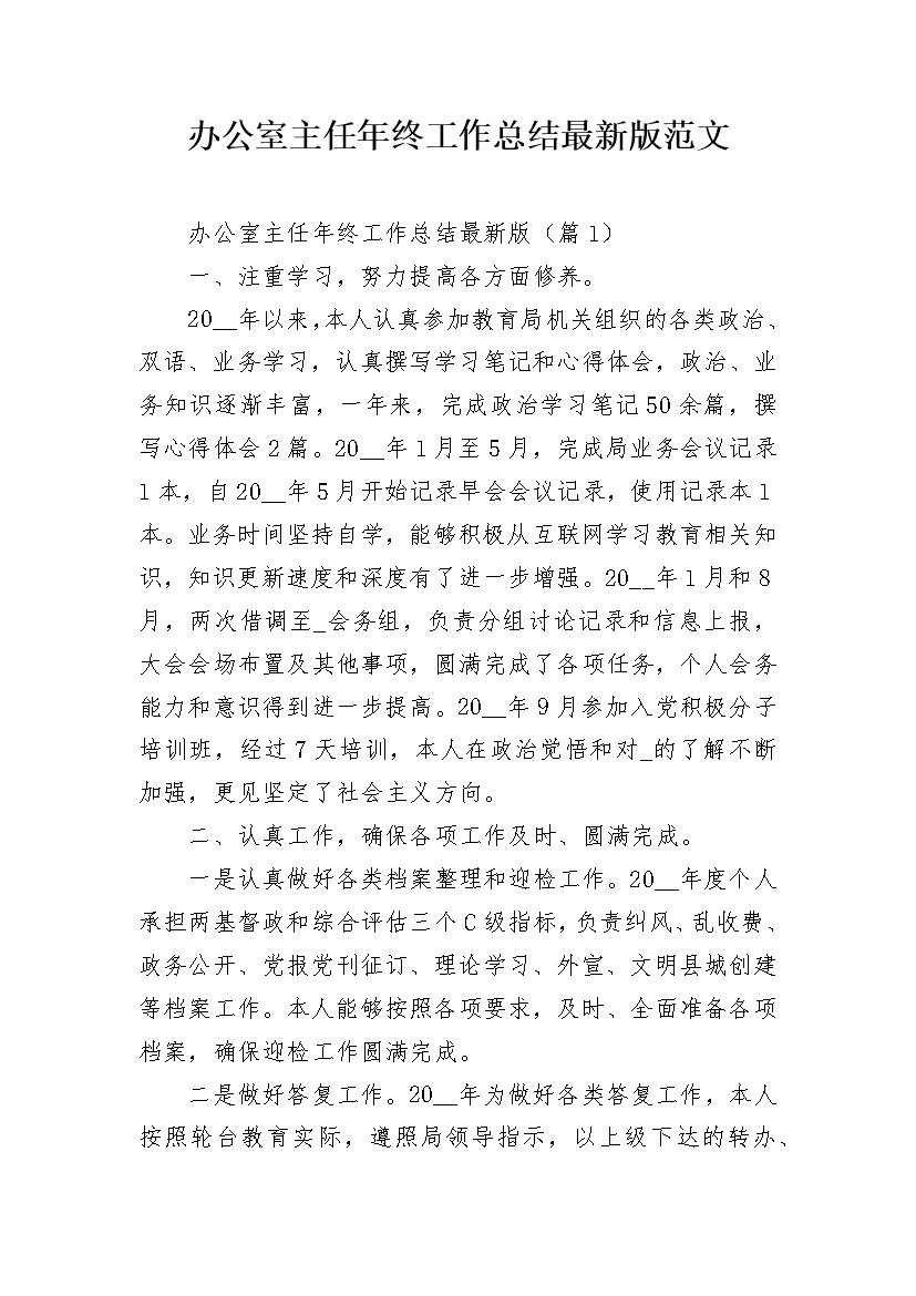 办公室主任年终工作总结最新版范文办公室主任年终工作总结最新版(篇1)一、注重学习,努力提高各方面修养。20__年以来,本人认真参加教育局机关组织的各类政治、双语、业务学习,认真撰写学习笔记和心得体会,政治、业务知识逐渐丰富,一年来,完成政治学习笔记50余篇,撰写心得体会2篇。20__年1月至5月,完成局业务会议记录1本,自20__年5月开始记录早会会议记录,使用记录本1本。业务时间坚持自学,能够积极从互联网学习教育相关知识,知识更新速度和深度有了进一步增强。20__年1月和8月,两次借调至_会务组,负责分