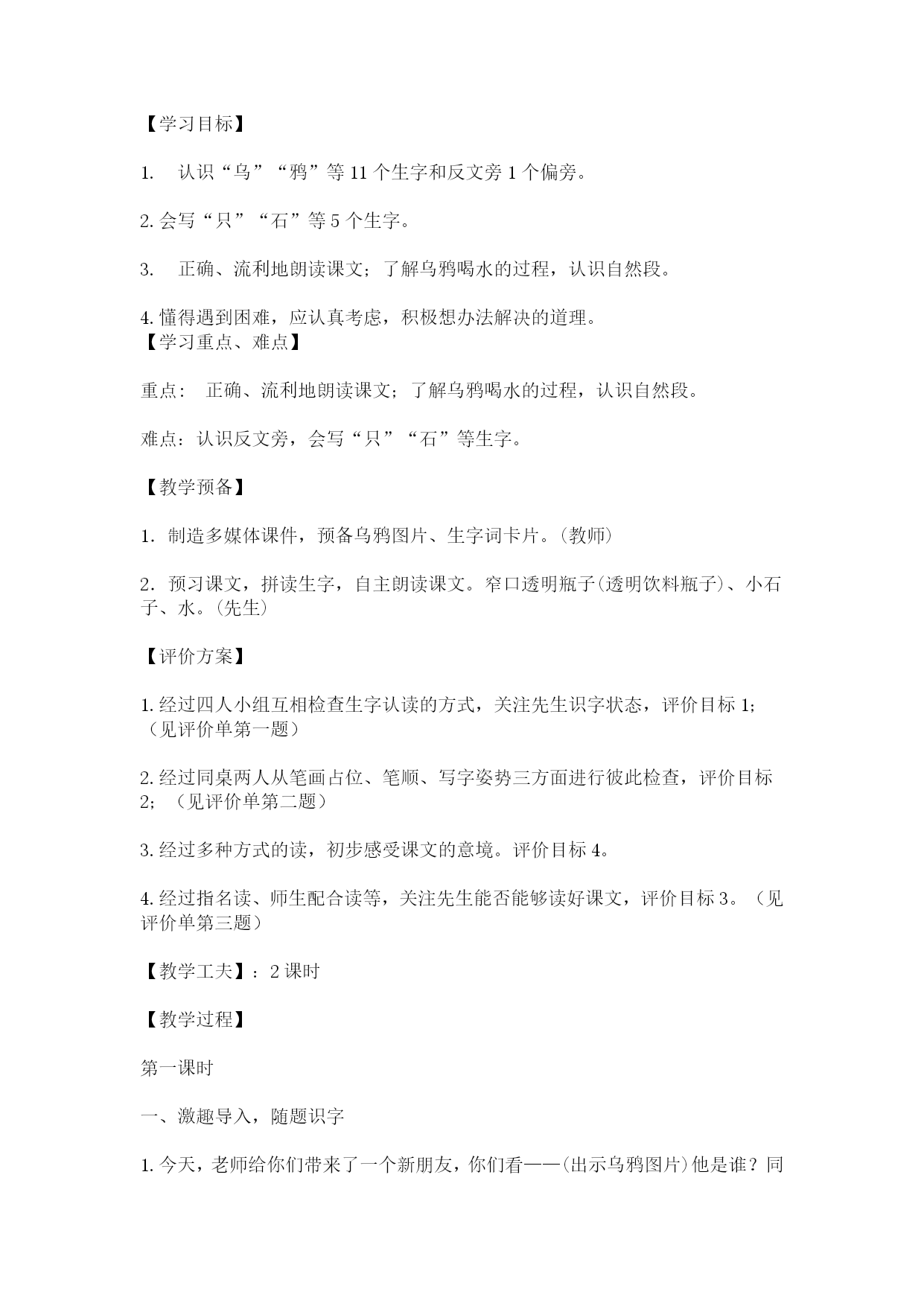 【学习目标】1.认识“乌”“鸦”等11个生字和反文旁1个偏旁。2.会写“只”“石”等5个生字。3.正确、流利地朗读课文;了解乌鸦喝水的过程,认识自然段。4.懂得遇到困难,应认真考虑,积极想办法解决的道理。【学习重点、难点】重点:正确、流利地朗读课文;了解乌鸦喝水的过程,认识自然段。难点:认识反文旁,会写“只”“石”等生字。【教学预备】1.制造多媒体课件,预备乌鸦图片、生字词卡片。(教师)2.预习课文,拼读生字,自主朗读课文。窄口透明瓶子(透明饮料瓶子)、小石子、水。(先生)【评价方案】1.经过四人小组互相