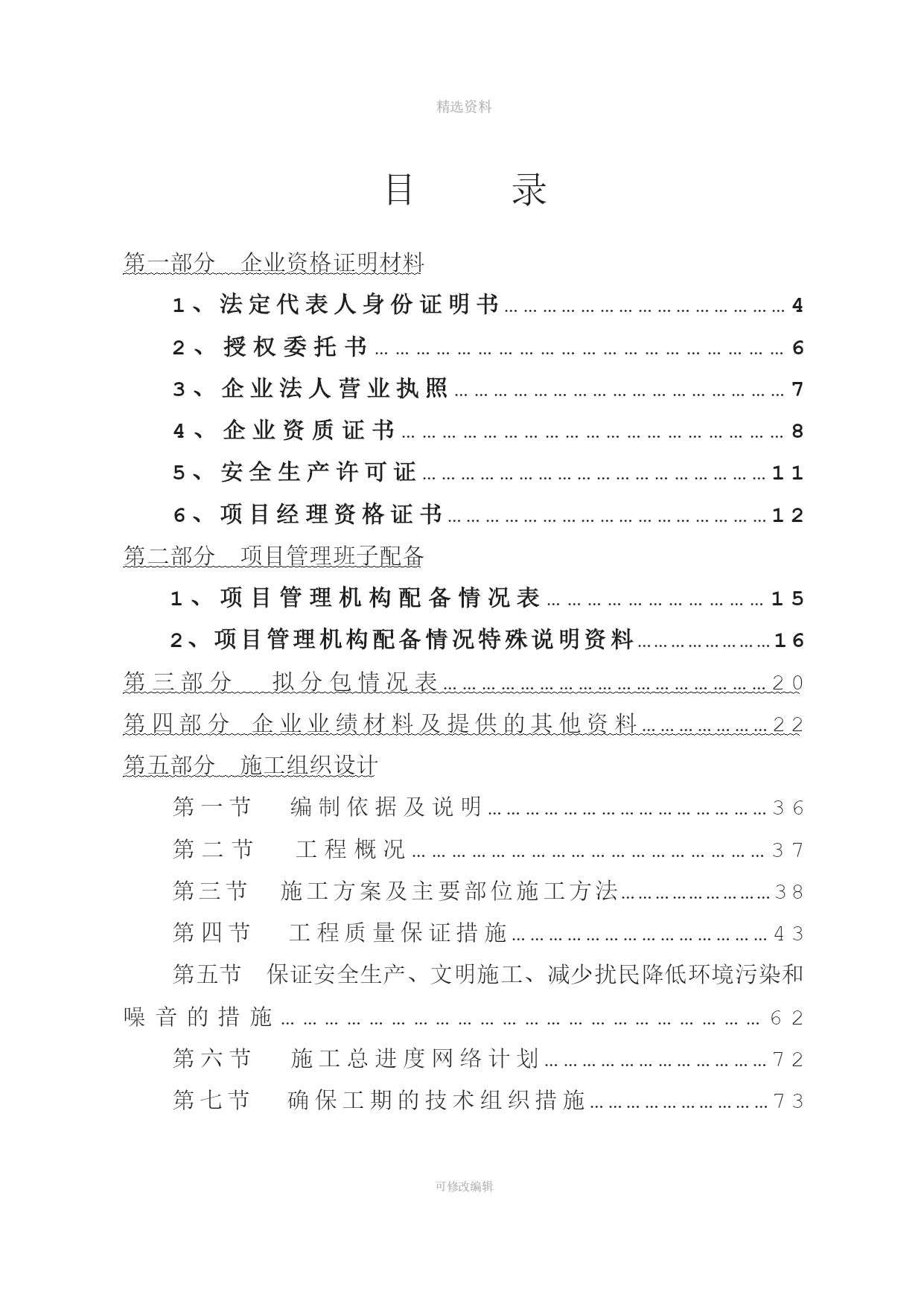 精选资料可修改编辑目录第一部分企业资格证明材料1、法定代表人身份证明书………………………………………42、授权委托书……………………………………………………63、企业法人营业执照……………………………………………74、企业资质证书…………………………………………………85、安全生产许可证………………………………………………116、项目经理资格证书……………………………………………12第二部分项目管理班子配备1、项目管理机构配备情况表……………………………152、项目管理机构配备情况特殊说明资料………………