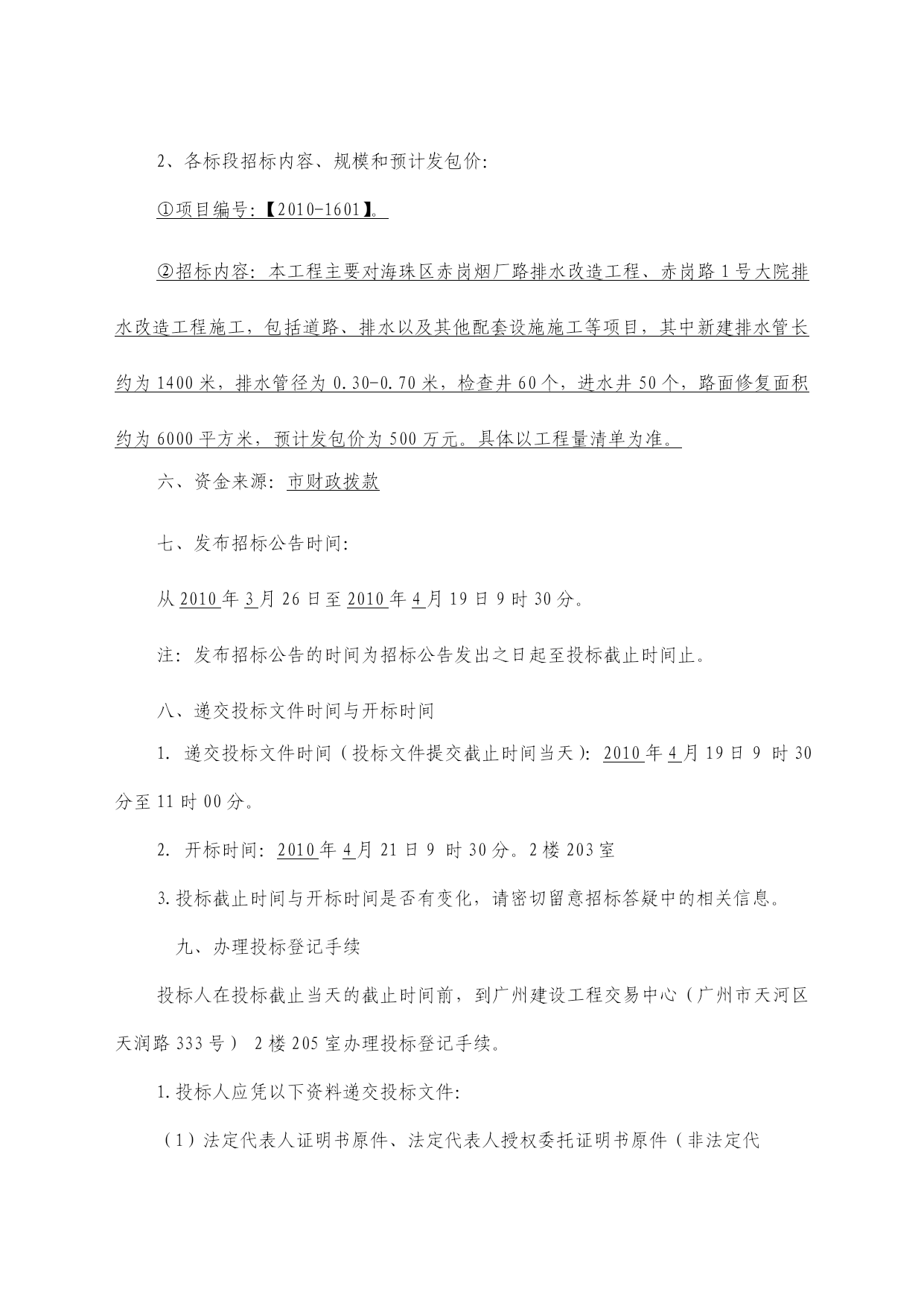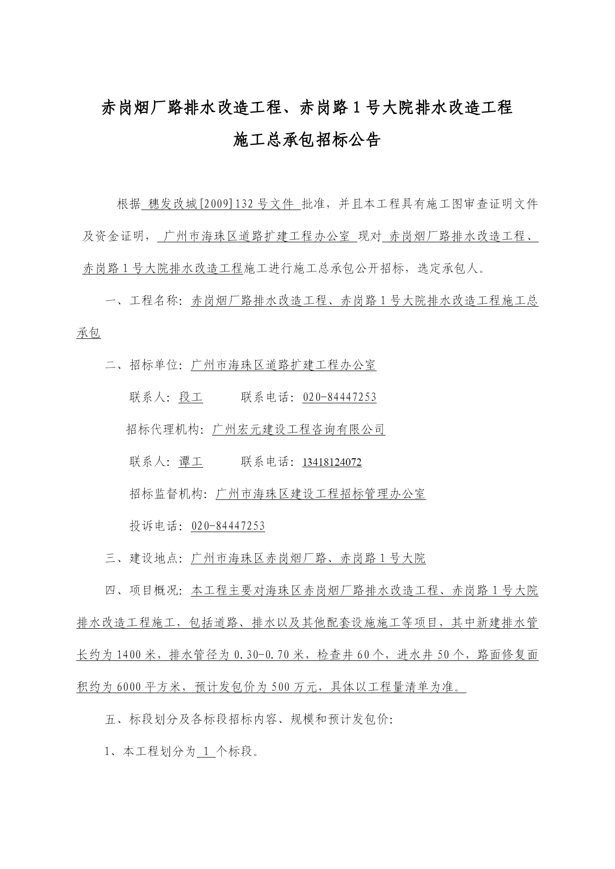赤岗烟厂路排水改造工程、赤岗路1号大院排水改造工程施工总承包招标公告根据穗发改城[2009]132号文件批准,并且本工程具有施工图审查证明文件及资金证明,广州市海珠区道路扩建工程办公室现对赤岗烟厂路排水改造工程、赤岗路1号大院排水改造工程施工进行施工总承包公开招标,选定承包人。一、工程名称:赤岗烟厂路排水改造工程、赤岗路1号大院排水改造工程施工总承包二、招标单位:广州市海珠区道路扩建工程办公室联系人:段工联系电话:020-84447253招标代理机构:广州宏元建设工程咨询有限公司联系人:谭工联系电话:13