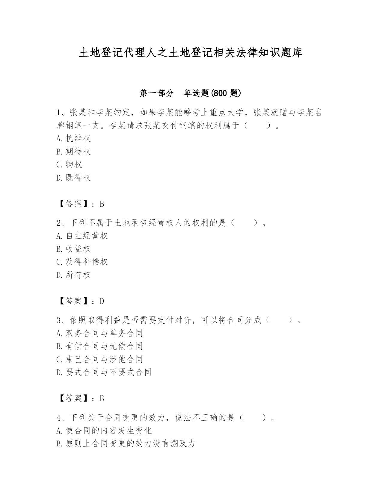 土地登记代理人之土地登记相关法律知识题库第一部分单选题(800题)1、张某和李某约定,如果李某能够考上重点大学,张某就赠与李某名牌钢笔一支。李某请求张某交付钢笔的权利属于()。A.抗辩权B.期待权C.物权D.既得权【答案】:B2、下列不属于土地承包经营权人的权利的是()。A.自主经营权B.收益权C.获得补偿权D.所有权【答案】:D3、依照取得利益是否需要支付对价,可以将合同分成()。A.双务合同与单务合同B.有偿合同与无偿合同C.束己合同与涉他合同D.要式合同与不要式合同【答案】:B4、下列关于合同变更的