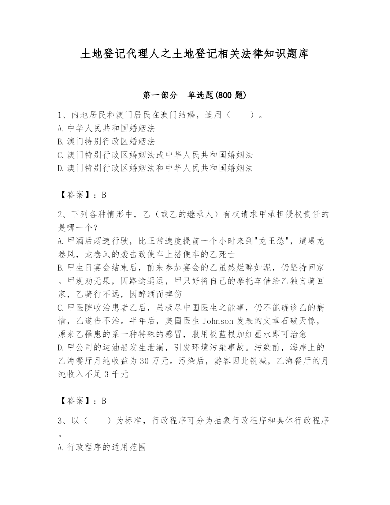 土地登记代理人之土地登记相关法律知识题库第一部分单选题(800题)1、内地居民和澳门居民在澳门结婚,适用()。A.中华人民共和国婚姻法B.澳门特别行政区婚姻法C.澳门特别行政区婚姻法或中华人民共和国婚姻法D.澳门特别行政区婚姻法和中华人民共和国婚姻法【答案】:B2、下列各种情形中,乙(或乙的继承人)有权请求甲承担侵权责任的是哪一个?A.甲酒后超速行驶,比正常速度提前一个小时来到"龙王愁",遭遇龙卷风,龙卷风的袭击致使车上搭便车的乙死亡B.甲生日宴会结束后,前来参加宴会的乙虽然烂醉如泥,仍坚持回家。甲规劝无