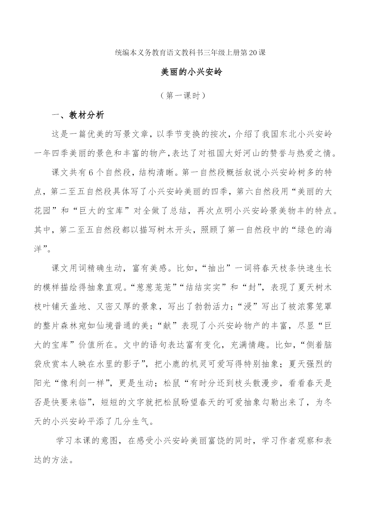 统编本义务教育语文教科书三年级上册第20课美丽的小兴安岭(第一课时)一、教材分析这是一篇优美的写景文章,以季节变换的按次,介绍了我国东北小兴安岭一年四季美丽的景色和丰富的物产,表达了对祖国大好河山的赞誉与热爱之情。课文共有6个自然段,结构清晰。第一自然段概括叙说小兴安岭树多的特点,第二至五自然段具体写了小兴安岭美丽的四季,第六自然段用“美丽的大花园”和“巨大的宝库”对全做了总结,再次点明小兴安岭景美物丰的特点。其中,第二至五自然段都以描写树木开头,照顾了第一自然段中的“绿色的海洋”。课文用词精确生动,富有