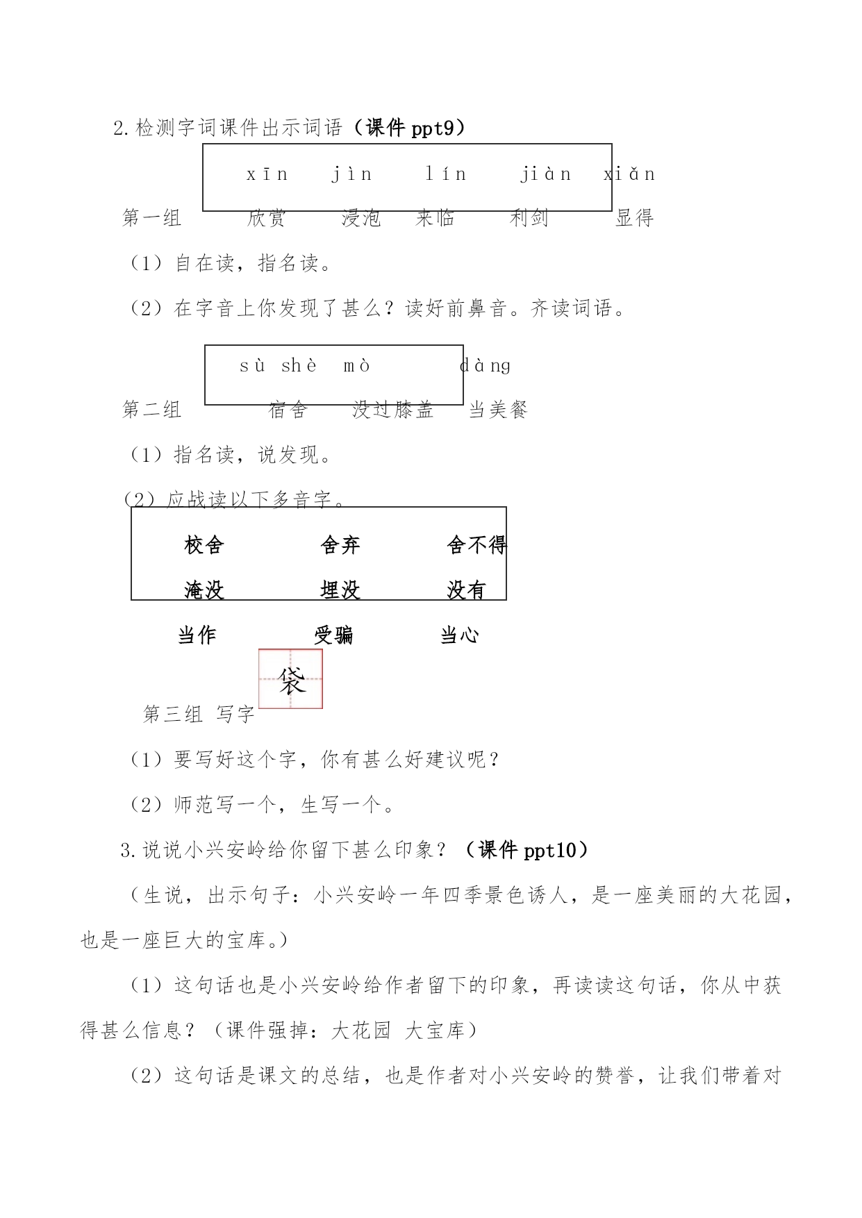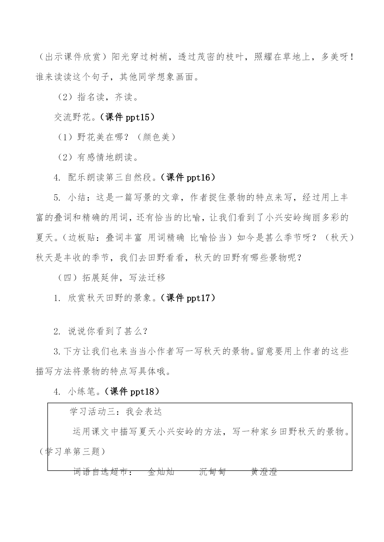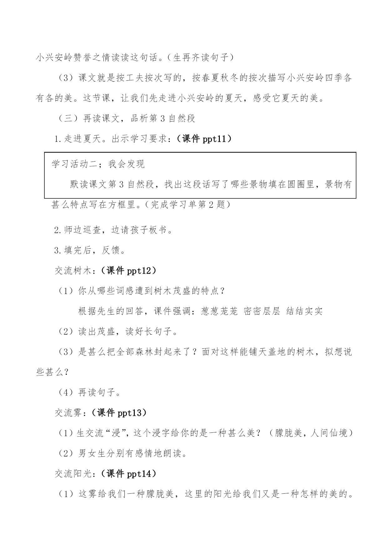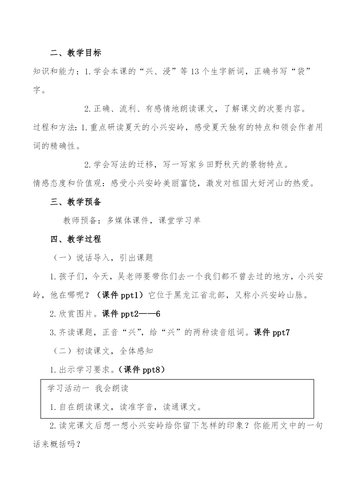 《美丽的小兴安岭》第一课时一、教学目标知识和能力:1.学会本课的“兴、浸”等13个生字新词,正确书写“袋”字。2.正确、流利、有感情地朗读课文,了解课文的次要内容。过程和方法:1.重点研读夏天的小兴安岭,感受夏天独有的特点和领会作者用词的精确性。2.学会写法的迁移,写一写家乡田野秋天的景物特点。情感态度和价值观:感受小兴安岭美丽富饶,激发对祖国大好河山的热爱。二、教学重难点教学重点:研读夏天的小兴安岭,感受夏天独有的特点和领会作者用词的精确性。2.教学难点:学会写法的迁移,写