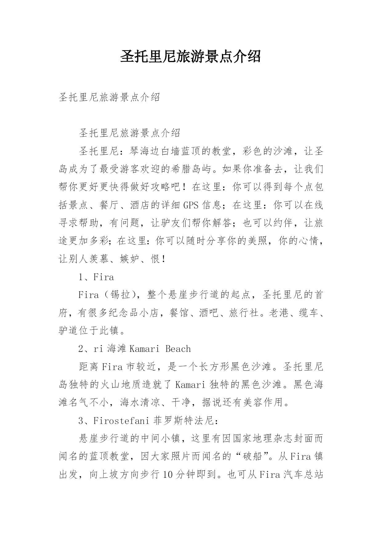 圣托里尼旅游景点介绍圣托里尼旅游景点介绍圣托里尼旅游景点介绍圣托里尼:琴海边白墙蓝顶的教堂,彩色的沙滩,让圣岛成为了最受游客欢迎的希腊岛屿。如果你准备去,让我们帮你更好更快得做好攻略吧!在这里:你可以得到每个点包括景点、餐厅、酒店的详细GPS信息;在这里:你可以在线寻求帮助,有问题,让驴友们帮你解答;也可以约伴,让旅途更加多彩;在这里:你可以随时分享你的美照,你的心情,让别人羡慕、嫉妒、恨!1、FiraFira(锡拉),整个悬崖步行道的起点,圣托里尼的首府,有很多纪念品小店,餐馆、酒吧、旅行社。老港、缆车