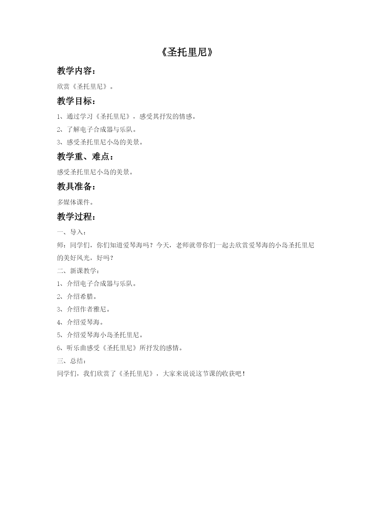 《圣托里尼》教学内容:欣赏《圣托里尼》。教学目标:1、通过学习《圣托里尼》,感受其抒发的情感。2、了解电子合成器与乐队。3、感受圣托里尼小岛的美景。教学重、难点:感受圣托里尼小岛的美景。教具准备:多媒体课件。教学过程:一、导入:师:同学们,你们知道爱琴海吗?今天,老师就带你们一起去欣赏爱琴海的小岛圣托里尼的美好风光,好吗?二、新课教学:1、介绍电子合成器与乐队。2、介绍希腊。3、介绍作者雅尼。4、介绍爱琴海。5、介绍爱琴海小岛圣托里尼。6、听乐曲感受《圣托里尼》所抒发的感情。三、总结:同学们,我们欣赏了《