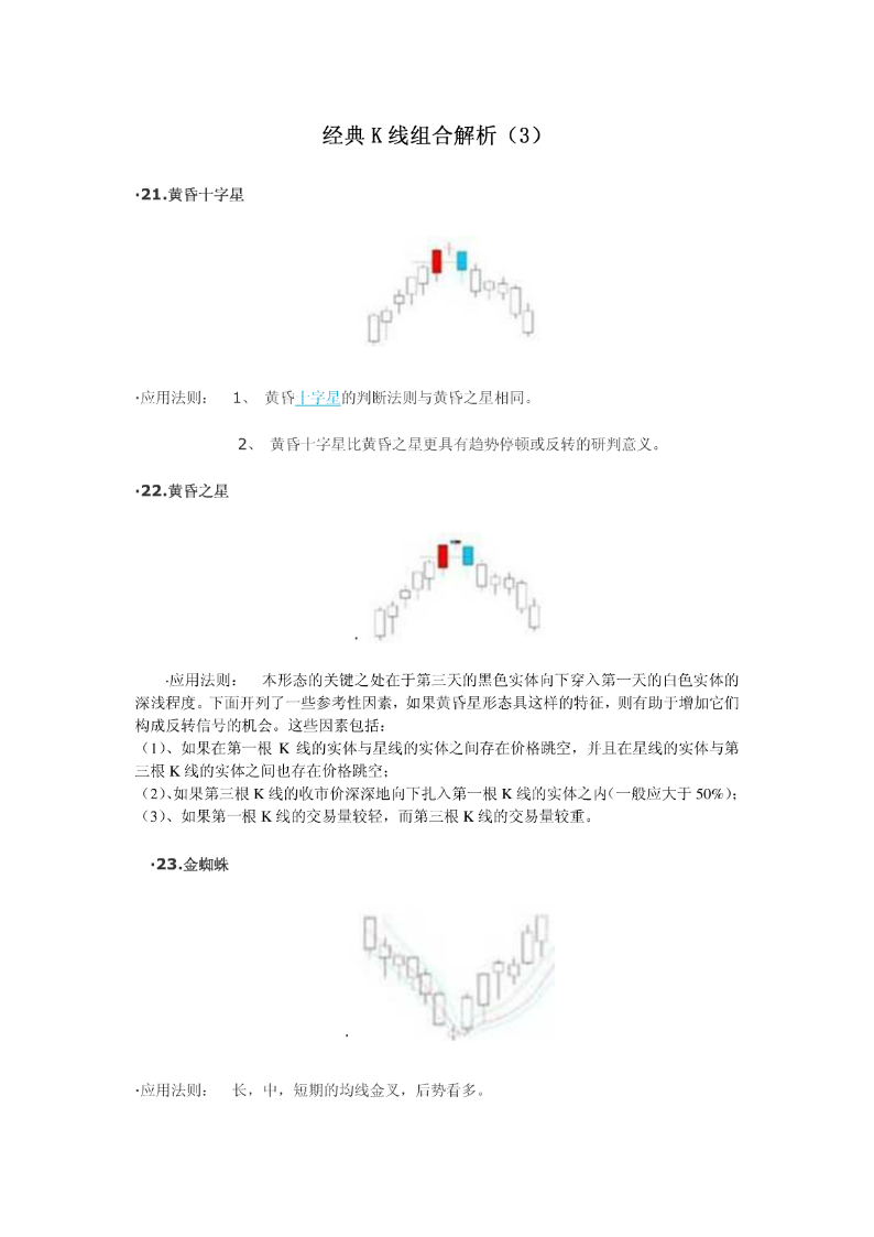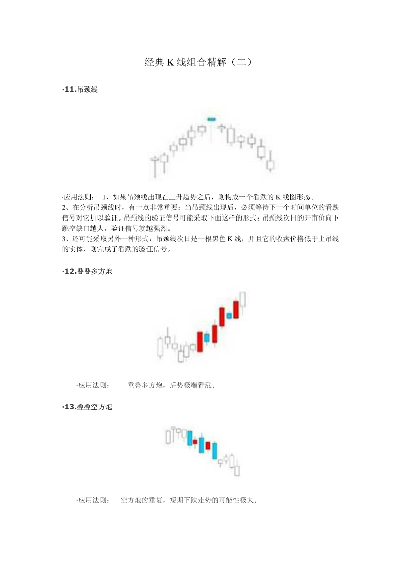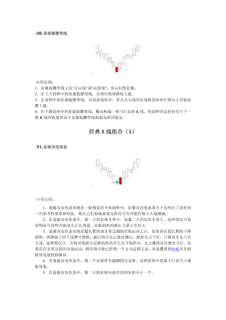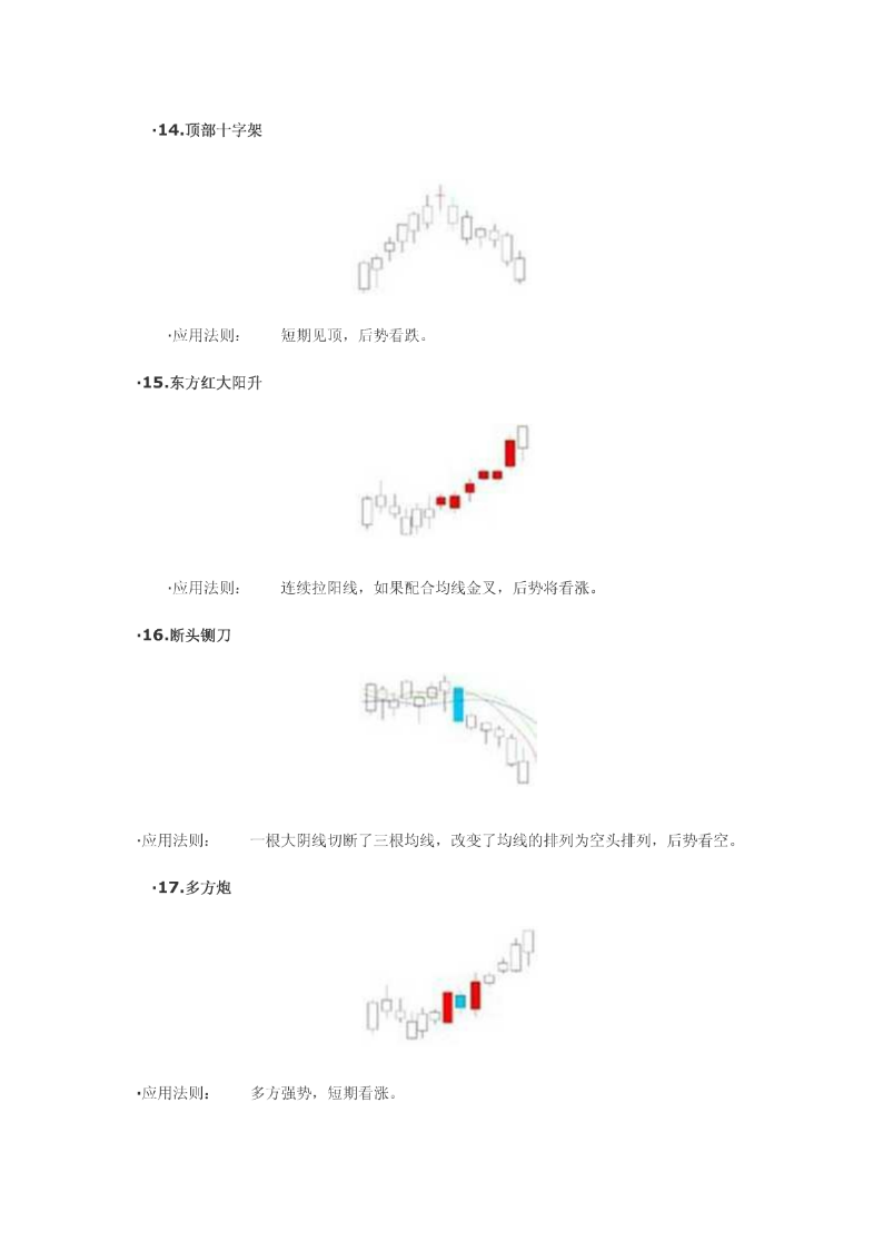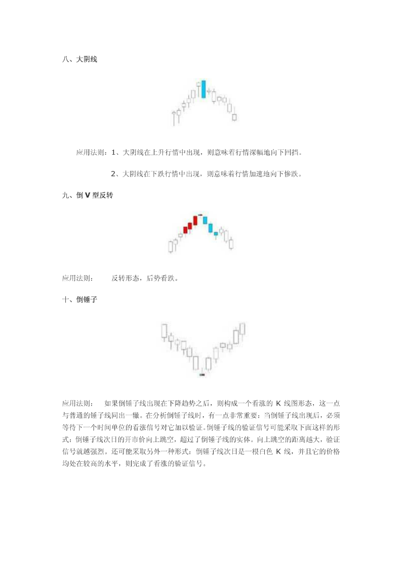 经典K线组合图解修改浏览权限|删除经典K线组合图解(上)1、T型线(蜻蜓)应用法则:连续下跌T线见,马上进场抢反弹底部看涨,顶部看跌的变盘线。2、V型反转V型反转,涨势不断应用法则:底部见底,反转上升。3、长上影线连续上涨长上影,抛出筹码不要等应用法则:1、长上影线出现在上升趋势的高位,若成交量放大,则意味着多头追高积极,但高位抛压沉重,股价向上攀越艰难,行情很可能调头回档或反转。2、长上影线出现在下降趋势的低位,若成交量放大,则意味着多头抄底盘介入,但不能有效遏制抛压,多空双方已逐渐转向势均力敌。4、长