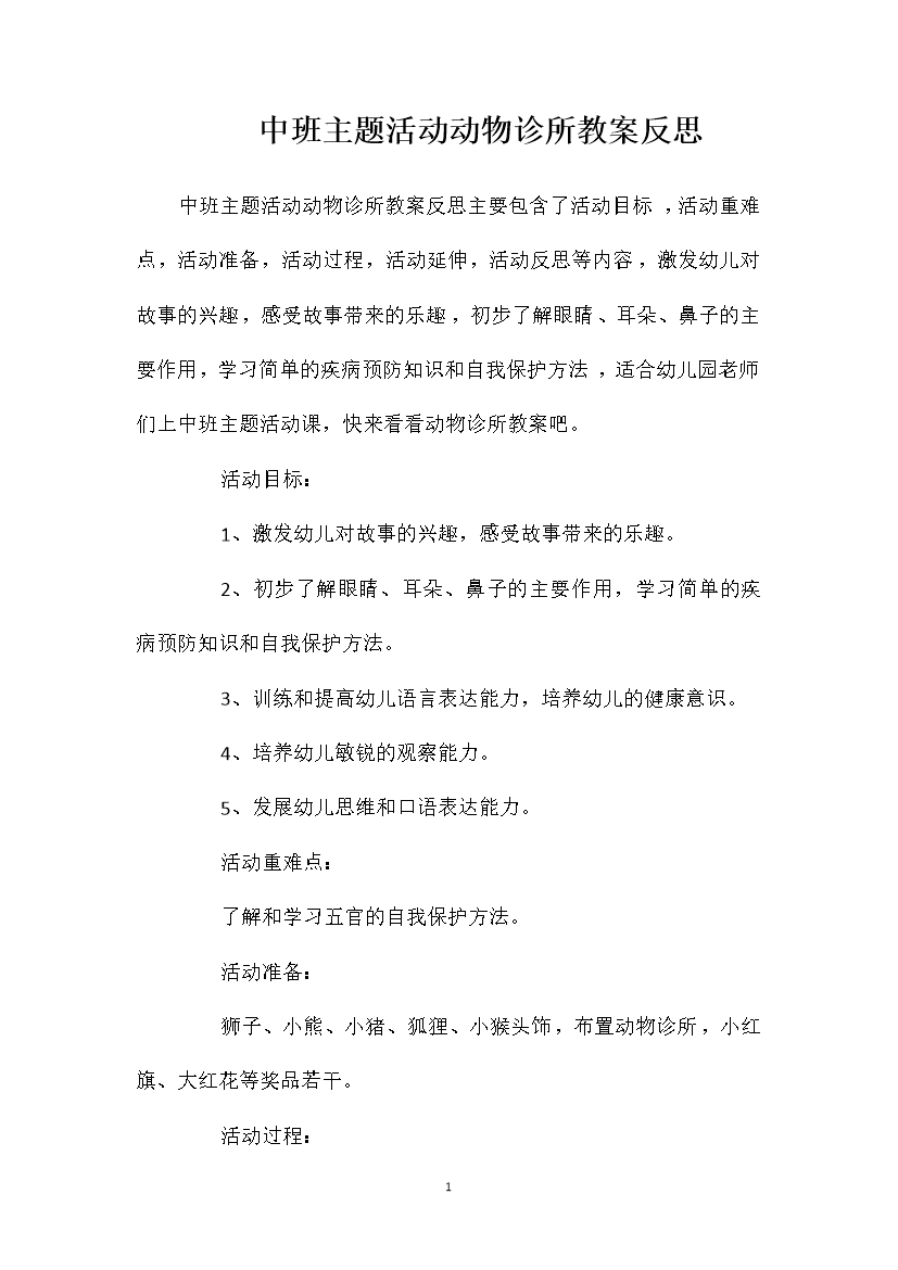 中班主题活动动物诊所教案反思中班主题活动动物诊所教案反思主要包含了活动目标,活动重难点,活动准备,活动过程,活动延伸,活动反思等内容,激发幼儿对故事的兴趣,感受故事带来的乐趣,初步了解眼睛、耳朵、鼻子的主要作用,学习简单的疾病预防知识和自我保护方法,适合幼儿园老师们上中班主题活动课,快来看看动物诊所教案吧。活动目标:1、激发幼儿对故事的兴趣,感受故事带来的乐趣。2、初步了解眼睛、耳朵、鼻子的主要作用,学习简单的疾病预防知识和自我保护方法。3、训练和提高幼儿语言表达能力,培养幼