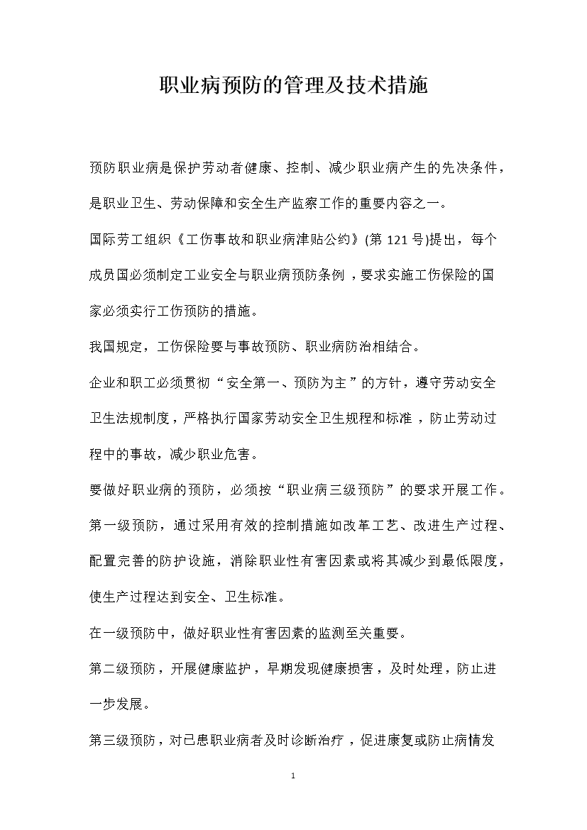 职业病预防的管理及技术措施预防职业病是保护劳动者健康、控制、减少职业病产生的先决条件,是职业卫生、劳动保障和安全生产监察工作的重要内容之一。国际劳工组织《工伤事故和职业病津贴公约》(第121号)提出,每个成员国必须制定工业安全与职业病预防条例,要求实施工伤保险的国家必须实行工伤预防的措施。我国规定,工伤保险要与事故预防、职业病防治相结合。企业和职工必须贯彻“安全第一、预防为主”的方针,遵守劳动安全卫生法规制度,严格执行国家劳动安全卫生规程和标准,防止劳动过程中的事故,减少职业危害。要做好职业病的预防,必须