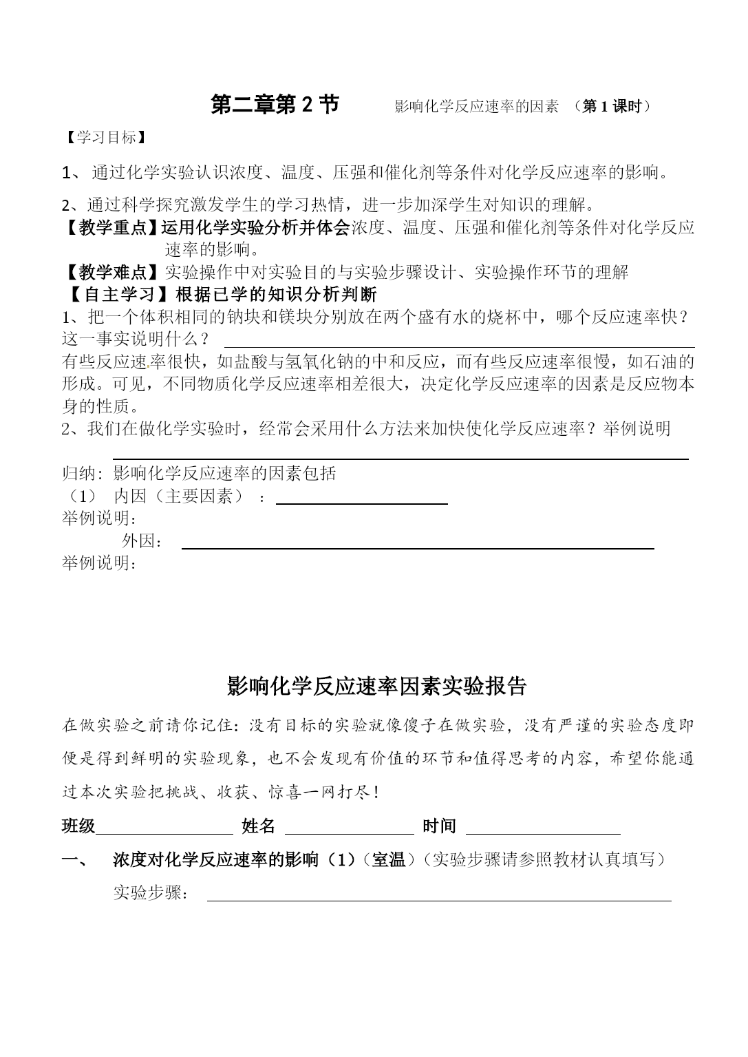 第二章第2节影响化学反应速率的因素(第1课时)【学习目标】1、通过化学实验认识浓度、温度、压强和催化剂等条件对化学反应速率的影响。2、通过科学探究激发学生的学习热情,进一步加深学生对知识的理解。【教学重点】运用化学实验分析并体会浓度、温度、压强和催化剂等条件对化学反应速率的影响。【教学难点】实验操作中对实验目的与实验步骤设计、实验操作环节的理解【自主学习】根据已学的知识分析判断1、把一个体积相同的钠块和镁块分别放在两个盛有水的烧杯中,哪个反应速率快?这一事实说明什么?有些反应速率很快,如盐酸与氢氧化钠的中