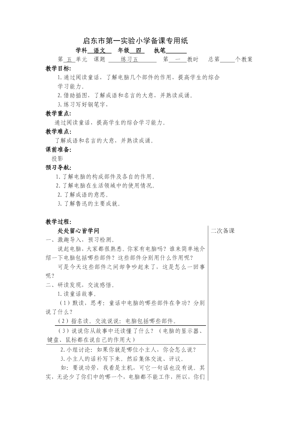 启东市第一实验小学备课专用纸学科语文年级四执笔第五单元课题练习五第一教时总第个教案教学目标:1.通过阅读童话,了解电脑几个部件的作用,提高学生的综合学习能力。2.借助插图,了解成语和名言的大意,并熟读成诵。3.练习写好钢笔字,教学重点:通过阅读童话,提高学生的综合学习能力。教学难点:了解成语和名言的大意,并熟读成诵。课前准备:投影预习导航:1.了解电脑的构成部件及各自的作用。2.了解电脑在生活领域中的使用情况。2.了解成语的意思。3.了解鲁迅的主要成就。教学过程:处处留心皆学问一、激趣导入,预习检测。说起