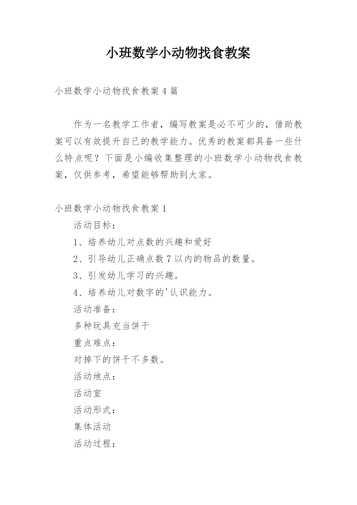 小班数学小动物找食教案小班数学小动物找食教案4篇作为一名教学工作者,编写教案是必不可少的,借助教案可以有效提升自己的教学能力。优秀的教案都具备一些什么特点呢?下面是小编收集整理的小班数学小动物找食教案,仅供参考,希望能够帮助到大家。小班数学小动物找食教案1活动目标:1、培养幼儿对点数的兴趣和爱好2、引导幼儿正确点数7以内的物品的数量。3、引发幼儿学习的兴趣。4、培养幼儿对数字的'认识能力。活动准备:多种玩具充当饼干重点难点:对掉下的饼干不多数。活动地点:活动室活动形式:集体活动活动过程:1、幼儿扮演小动物
