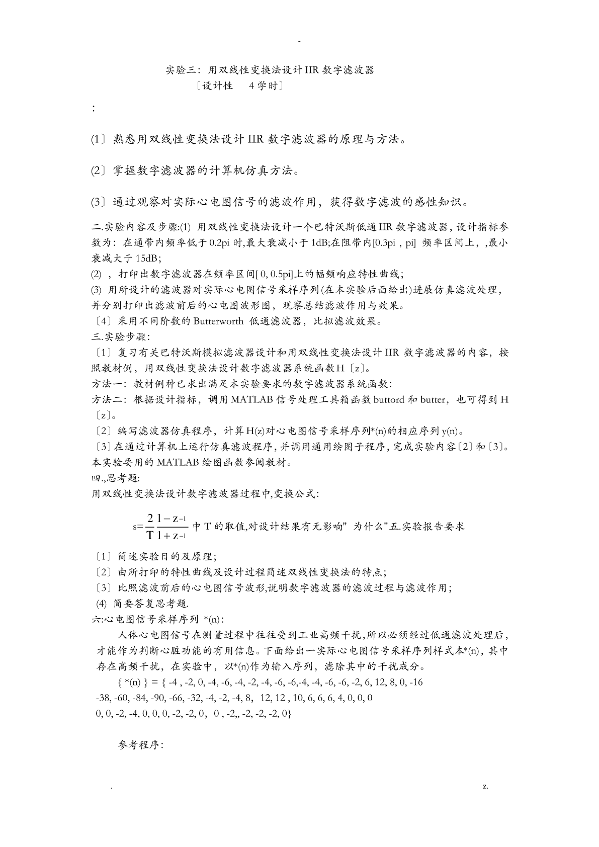 实验_三_题目_用双线性变换法设计IIR数字滤波器第16周星期_3_第6,7节实验目的(1)熟悉用双线性变换法设计IIR数字滤波器的原理与方法。(2)掌握数字滤波器的计算机仿真方法。(3)通过观察对实际心电图信号的滤波作用,获得数字滤波的感性知识。二、实验内容、方法、设计程序及实验结果复习有关巴特沃斯模拟滤波器设计和用双线性变换法设计IIR数字滤波器的内容,用双线性变换法设计数字滤波器系统函数。其中满足本实验要求的数字滤波器系统函数为:(3.1)式中:(3.2)根据设计指标,调用MATLAB信号处理工具箱