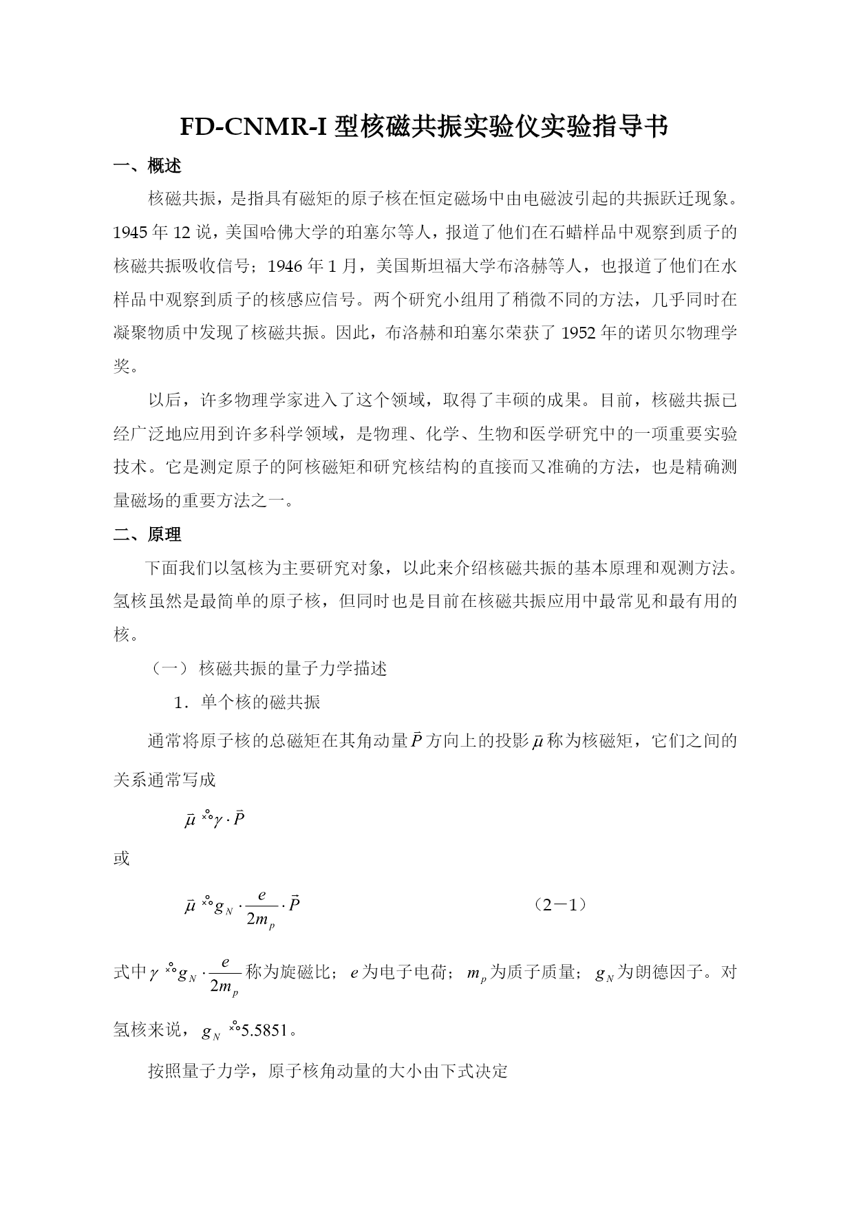 FD-CNMR-I型核磁共振实验仪实验指导书一、概述核磁共振,是指具有磁矩的原子核在恒定磁场中由电磁波引起的共振跃迁现象。1945年12说,美国哈佛大学的珀塞尔等人,报道了他们在石蜡样品中观察到质子的核磁共振吸收信号;1946年1月,美国斯坦福大学布洛赫等人,也报道了他们在水样品中观察到质子的核感应信号。两个研究小组用了稍微不同的方法,几乎同时在凝聚物质中发现了核磁共振。因此,布洛赫和珀塞尔荣获了1952年的诺贝尔物理学奖。以后,许多物理学家进入了这个领域,取得了丰硕的成果