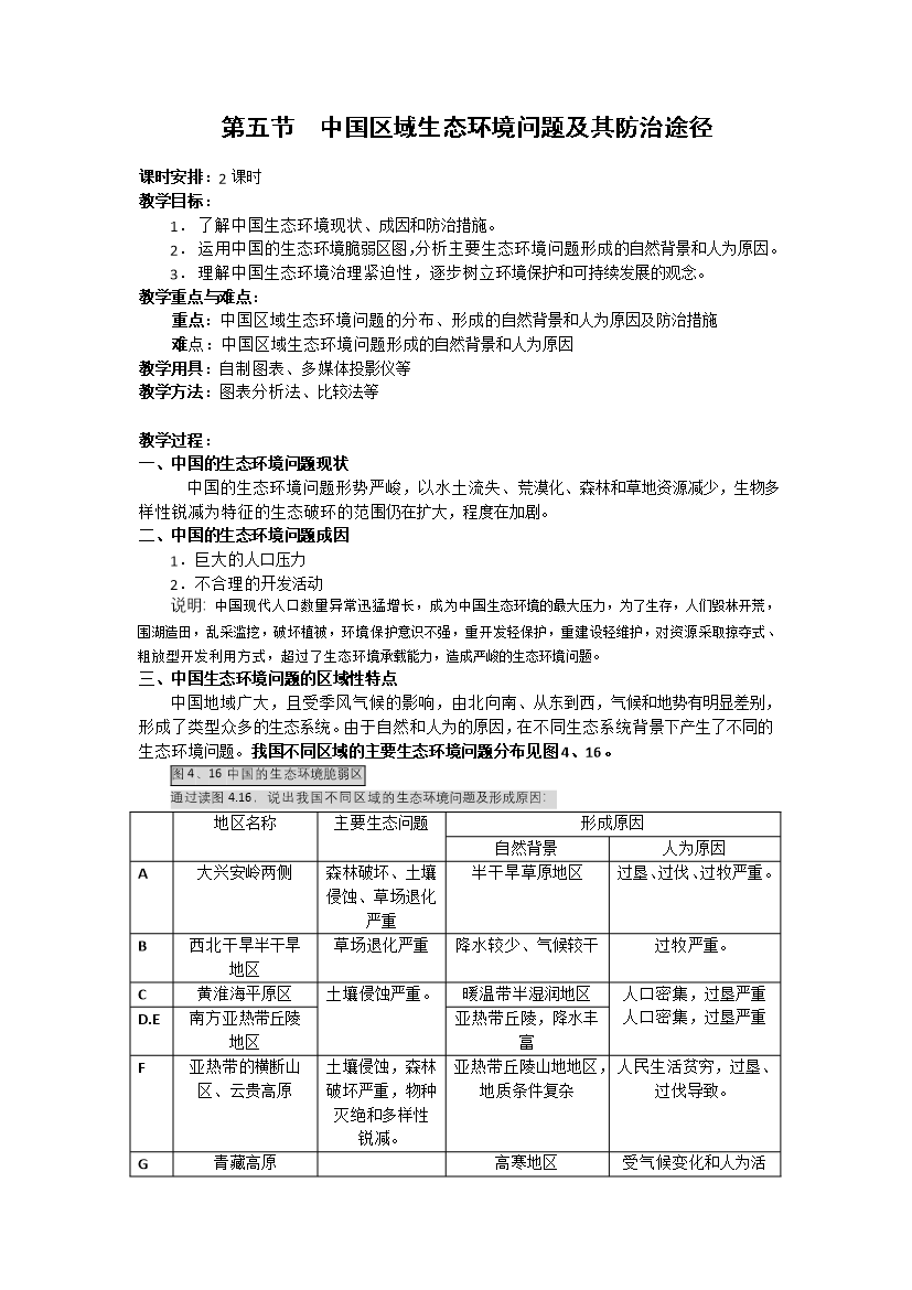 第五节中国区域生态环境问题及其防治途径课时安排:2课时教学目标:了解中国生态环境现状、成因和防治措施。运用中国的生态环境脆弱区图分析主要生态环境问题形成的自然背景和人为原因。理解中国生态环境治理紧迫性逐步树立环境保护和可持续发展的观念。教学重点与难点:重点:中国区域生态环境问题的分布、形成的自然背景和人为原因及防治措施难点:中国区域生态环境问题形成的自然背景和人为原因教学用具:自制图表、多媒体投影仪等教学方法:图表分析法、比较法等教学过程:一、中国的生态环境问题现状中国的生态环境问题形