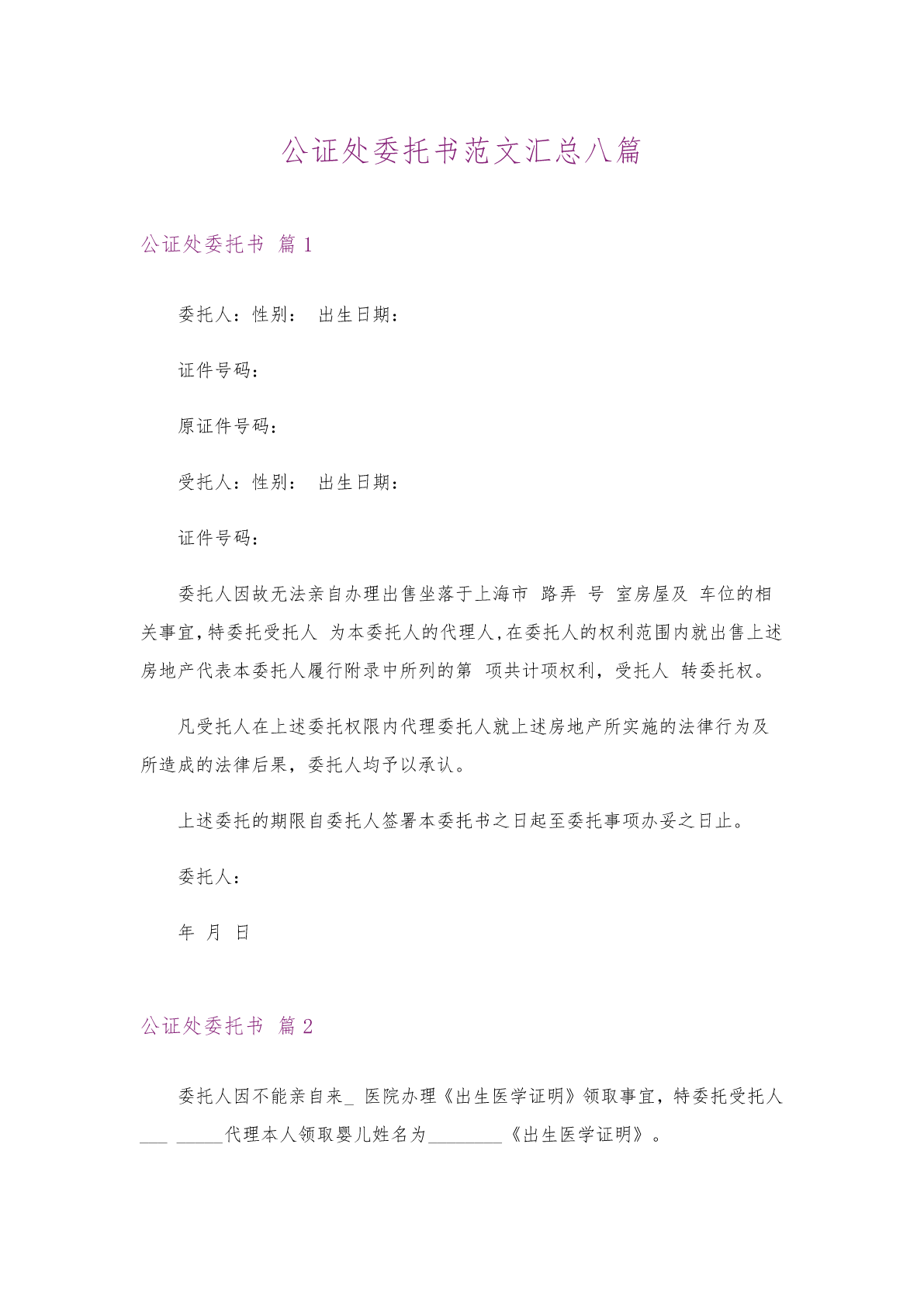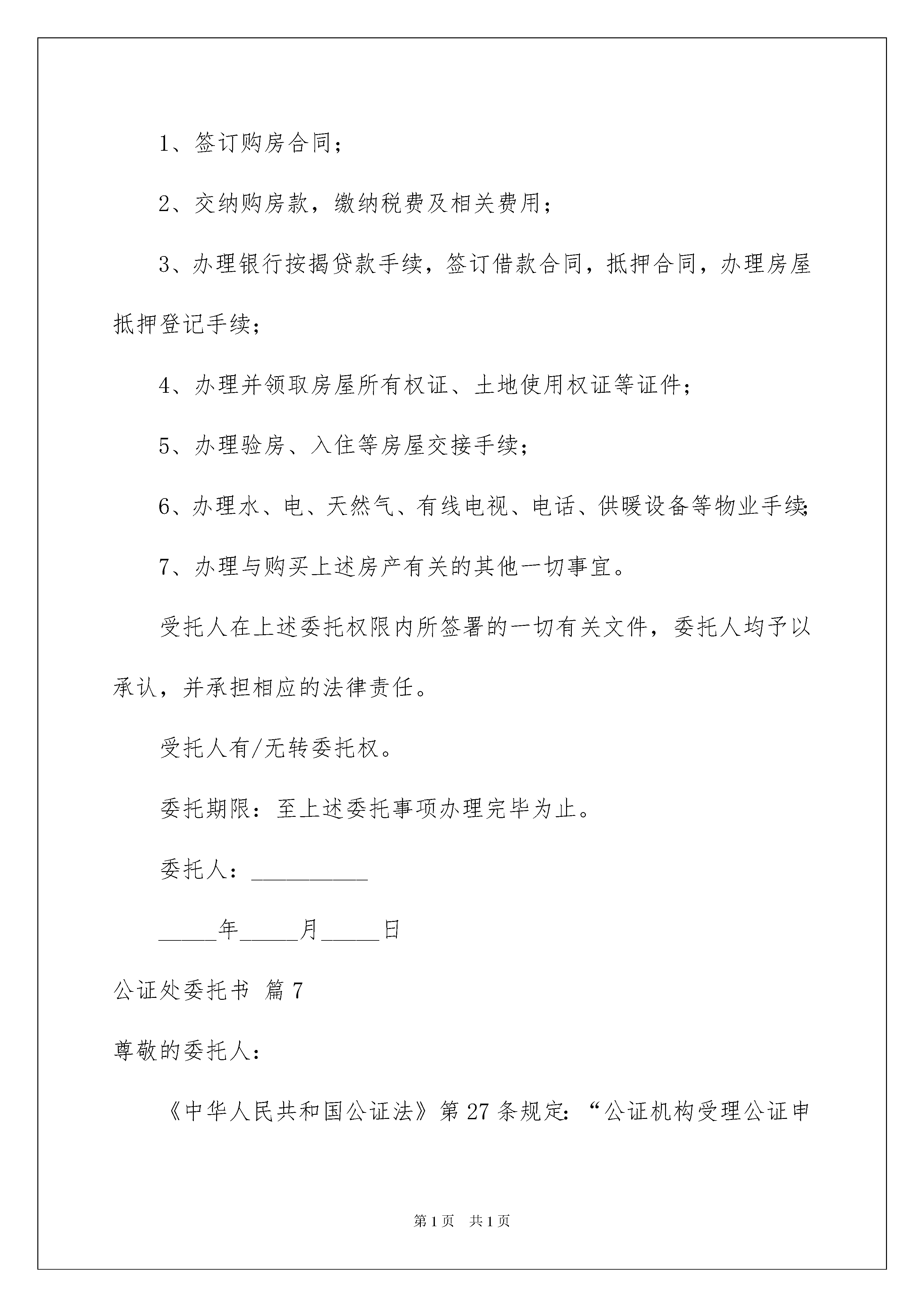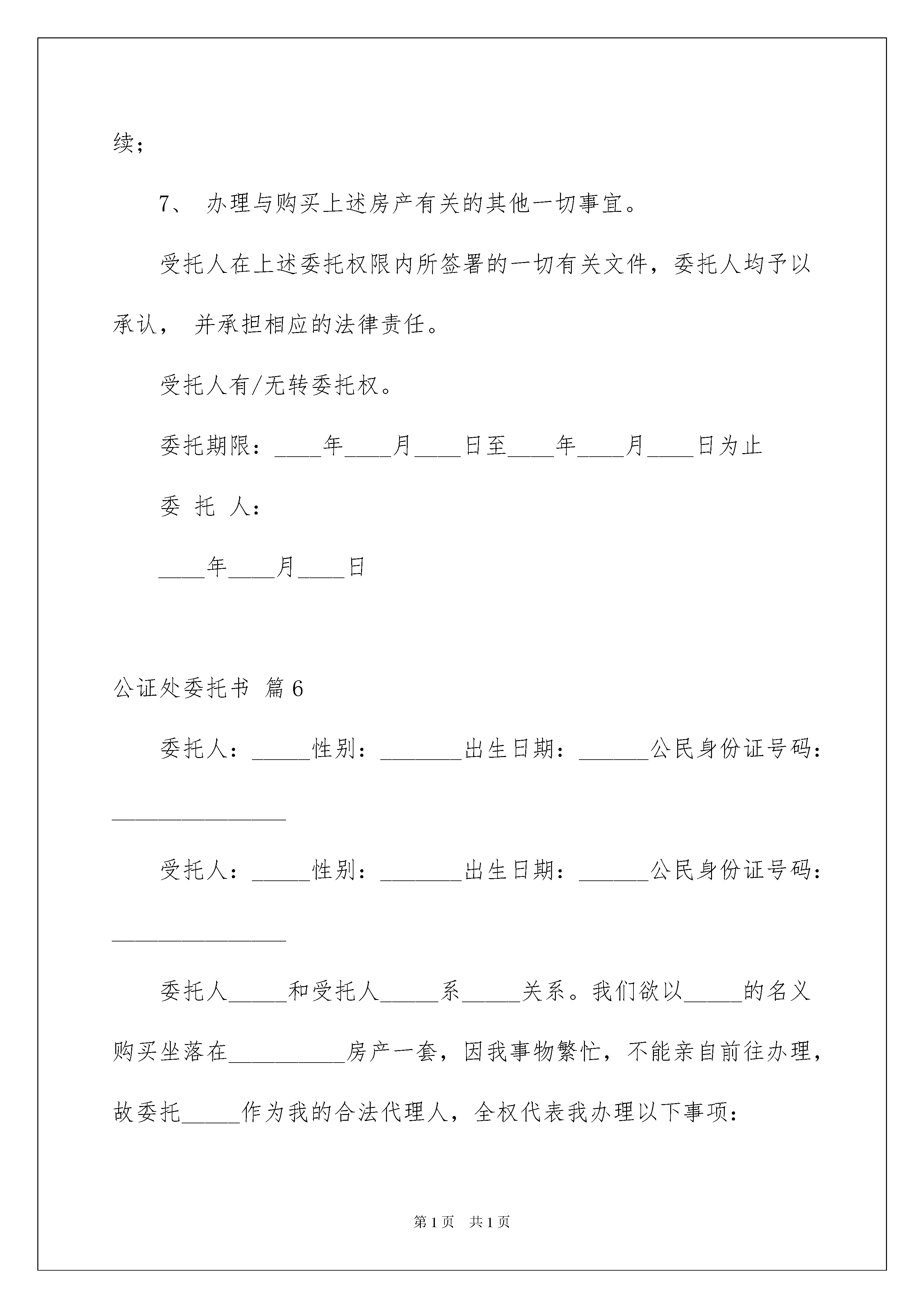2022公证处委托书范文汇总7篇公证处委托书范文汇总7篇被委托人如果做出违背国家法律的任何权益,委托人有权终止委托协议。随着社会不断地进步,委托书在处理事务上的使用频率越来越高,你写委托书时总是无从下手?以下是我收集整理的公证处委托书7篇,欢迎大家分享。公证处委托书篇1委托单λ:_____________法定代表人:_____________法人授权责任人姓名:_____________联系电话:_____________身份证号码:_____________工作单位:_____________现委托上述授权责任人作为我单λ在____日常管理上全权代表,代表法人签署相关文件,并承担相应的法律责任。本授权有效期为此授权书签发之日起至法人代表书面声明本授权作废为止。后附法定代表人身份证复印件(加盖人名章或签名)和法人授权责任人身份证复印件(加盖人名章或签名)。委托单位:(盖章)法定代表人:(签名或盖章)法人授权责任人:(签名或盖章)XXXX年XX月XX日说明:1、法人授权委托书所签发的代理期限必须涵盖代理人所有签字为有效时间。2、委托书内容填写要明确,文字要工整清楚,涂改无效。3、委托书不得转借、转让,不得买卖。4、代理人根据授权范Χ,以委托单λ的名义签订合同,并将此委托书提交给对方作为合同附件。公证处委托书篇2兹委托_____身份证号码_______________为我代理人,代表我办理《出生公证》事宜,代理人在其权限范围内签署一切有关文件,我均予承认,由此在法律上产生权利、义务均由委托人享有跟承担。委托代理人:_____(签字)委托人:_____(签字)委托人身份证号码:_____公证处委托书篇3委托人:_____,男/女,_____年_____月_____日出生,公民身份证号码:_______________受托人:_____,男/女,_____年_____月_____日出生,公民身份证号码:_______________我们(委托人_____和受托人_____)系_____关系。我们欲以_____名义购买坐落在__________房产一套,因我事物繁忙,不能亲自前往办理,特委托_____作为我合法代理人,全权代表我办理如下事项:1、签订购房合同;2、交纳购房款,缴纳税费及相关费用;3、办理银行按揭贷款手续,签订借款合同,抵押合同,办理房屋抵押登记手续;4、办理并领取房屋所有权证、土地使用权证等证件;5、办理验房、入住等房屋交接手续;6、办理水、电、天然气、有线电视、电话、供暖设备等物业手续;7、办理与购买上述房产有关其他一切事宜。受托人在上述委托权限内所签署一切有关文件,委托人均予以承认,并承担相应法律责任。受托人有/无转委托权。委托期限:至上述委托事项办理完毕为止。委托人:_______________年_____月_____日公证处委托书篇4委托人因不能亲自来_医院办理《出生医学证明》领取事宜,特委托受托人________代理本人领取婴儿姓名为________《出生医学证明》。凡由受托人在上述委托权利内,代理委托人行为所造成法律结果,委托人均予以承认。委托期限自委托人签署授权委托书之日起至受托人领取《出生医学证明》之日止。委托人签名:受托人签名:年月日年月日公证处委托书篇5委托书委托人:____,男/女,____年____月____日出生,公民身份证号码:____________受托人:____,男/女,____年____月____日出生,公民身份证号码:____________我们(委托人____和受托人____)系____关系。我们欲以____的名义购买坐落在_______房产一套,因我事物繁忙,不能亲自前往办理,特委托____作为我的合法代理人,全权代表我办理如下事项:1、签订购房合同;2、交纳购房款,缴纳税费及相关费用;3、办理银行按揭贷款手续,签订借款合同,抵押合同,办理房屋抵押登记手续;4、办理并领取房屋所有权证、土地使用权证等证件;5、办理验房、入住等房屋交接手续;6、办理水、电、天然气、有线电视、电话、供暖设备等物业手续;7、办理与购买上述房产有关的其他一切事宜。受托人在上述委托权限内所签署的一切有关文件,委托人均予以承认,并承担相应的法律责任。受托人有/无转委托权。委托期限:____年____月____日至____年____月____日为止委托人:____年____月____日公证处委托书篇6委托人:_____性别:_______出生日期:______公民身份证号码:_______________受托人:_____性别:_______出生日期:_