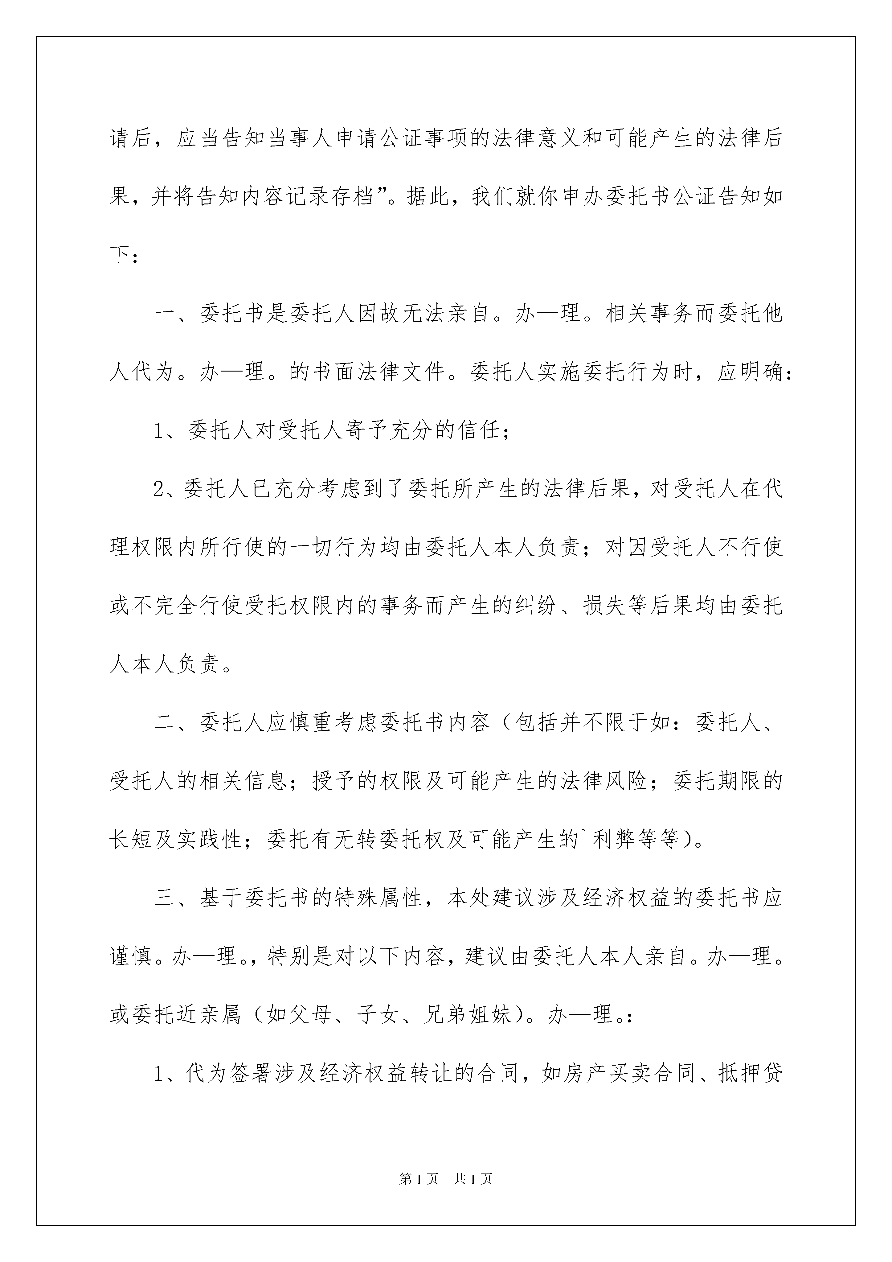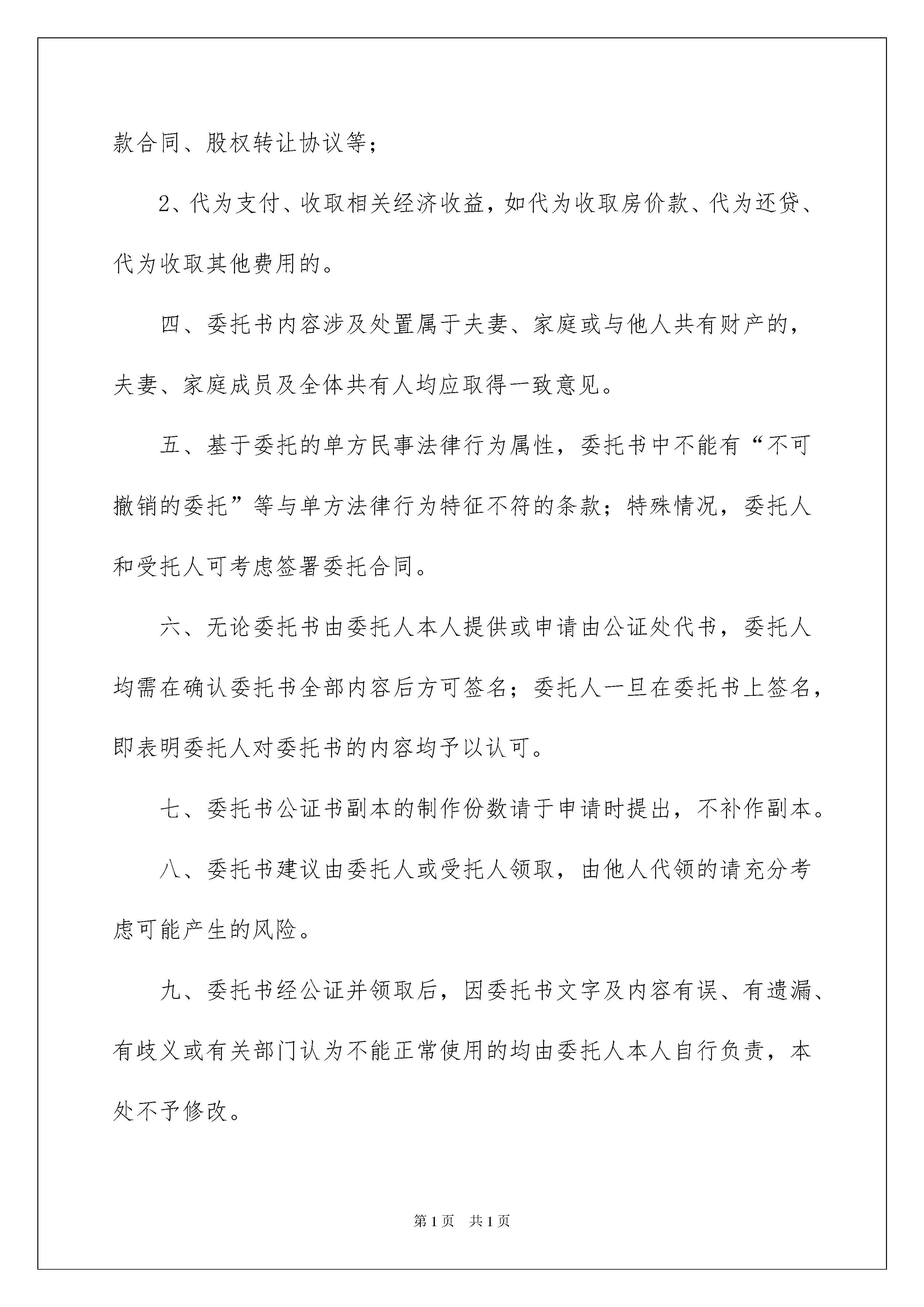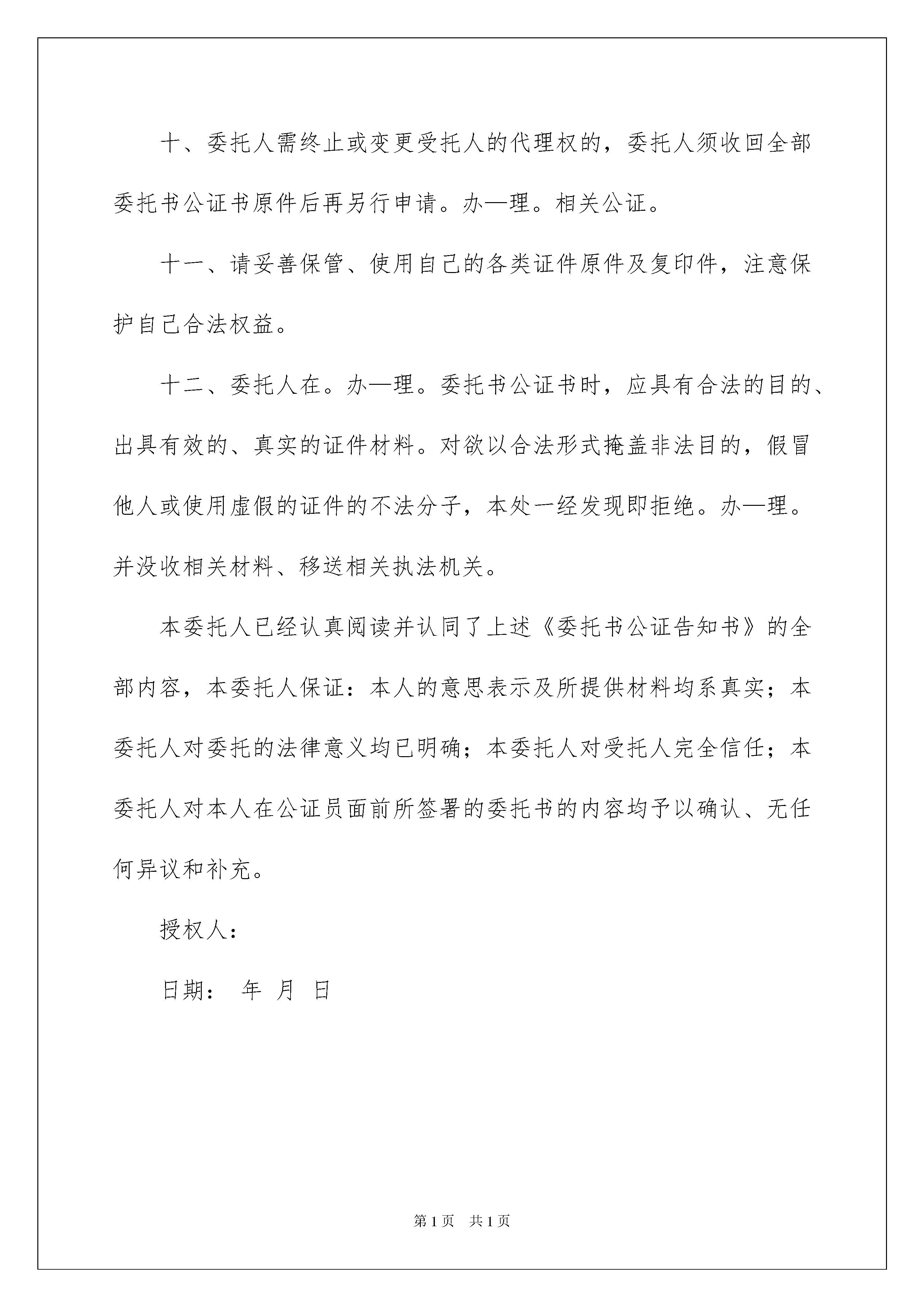 2022公证处委托书范文汇总7篇公证处委托书范文汇总7篇被委托人如果做出违背国家法律的任何权益,委托人有权终止委托协议。随着社会不断地进步,委托书在处理事务上的使用频率越来越高,你写委托书时总是无从下手?以下是我收集整理的公证处委托书7篇,欢迎大家分享。公证处委托书篇1委托单λ:_____________法定代表人:_____________法人授权责任人姓名:_____________联系电话:_____________身份证号码:_____________工作单位:_____________现委托上述授权责任人作为我单λ在____日常管理上全权代表,代表法人签署相关文件,并承担相应的法律责任。本授权有效期为此授权书签发之日起至法人代表书面声明本授权作废为止。后附法定代表人身份证复印件(加盖人名章或签名)和法人授权责任人身份证复印件(加盖人名章或签名)。委托单位:(盖章)法定代表人:(签名或盖章)法人授权责任人:(签名或盖章)XXXX年XX月XX日说明:1、法人授权委托书所签发的代理期限必须涵盖代理人所有签字为有效时间。2、委托书内容填写要明确,文字要工整清楚,涂改无效。3、委托书不得转借、转让,不得买卖。4、代理人根据授权范Χ,以委托单λ的名义签订合同,并将此委托书提交给对方作为合同附件。公证处委托书篇2兹委托_____身份证号码_______________为我代理人,代表我办理《出生公证》事宜,代理人在其权限范围内签署一切有关文件,我均予承认,由此在法律上产生权利、义务均由委托人享有跟承担。委托代理人:_____(签字)委托人:_____(签字)委托人身份证号码:_____公证处委托书篇3委托人:_____,男/女,_____年_____月_____日出生,公民身份证号码:_______________受托人:_____,男/女,_____年_____月_____日出生,公民身份证号码:_______________我们(委托人_____和受托人_____)系_____关系。我们欲以_____名义购买坐落在__________房产一套,因我事物繁忙,不能亲自前往办理,特委托_____作为我合法代理人,全权代表我办理如下事项:1、签订购房合同;2、交纳购房款,缴纳税费及相关费用;3、办理银行按揭贷款手续,签订借款合同,抵押合同,办理房屋抵押登记手续;4、办理并领取房屋所有权证、土地使用权证等证件;5、办理验房、入住等房屋交接手续;6、办理水、电、天然气、有线电视、电话、供暖设备等物业手续;7、办理与购买上述房产有关其他一切事宜。受托人在上述委托权限内所签署一切有关文件,委托人均予以承认,并承担相应法律责任。受托人有/无转委托权。委托期限:至上述委托事项办理完毕为止。委托人:_______________年_____月_____日公证处委托书篇4委托人因不能亲自来_医院办理《出生医学证明》领取事宜,特委托受托人________代理本人领取婴儿姓名为________《出生医学证明》。凡由受托人在上述委托权利内,代理委托人行为所造成法律结果,委托人均予以承认。委托期限自委托人签署授权委托书之日起至受托人领取《出生医学证明》之日止。委托人签名:受托人签名:年月日年月日公证处委托书篇5委托书委托人:____,男/女,____年____月____日出生,公民身份证号码:____________受托人:____,男/女,____年____月____日出生,公民身份证号码:____________我们(委托人____和受托人____)系____关系。我们欲以____的名义购买坐落在_______房产一套,因我事物繁忙,不能亲自前往办理,特委托____作为我的合法代理人,全权代表我办理如下事项:1、签订购房合同;2、交纳购房款,缴纳税费及相关费用;3、办理银行按揭贷款手续,签订借款合同,抵押合同,办理房屋抵押登记手续;4、办理并领取房屋所有权证、土地使用权证等证件;5、办理验房、入住等房屋交接手续;6、办理水、电、天然气、有线电视、电话、供暖设备等物业手续;7、办理与购买上述房产有关的其他一切事宜。受托人在上述委托权限内所签署的一切有关文件,委托人均予以承认,并承担相应的法律责任。受托人有/无转委托权。委托期限:____年____月____日至____年____月____日为止委托人:____年____月____日公证处委托书篇6委托人:_____性别:_______出生日期:______公民身份证号码:_______________受托人:_____性别:_______出生日期:_
