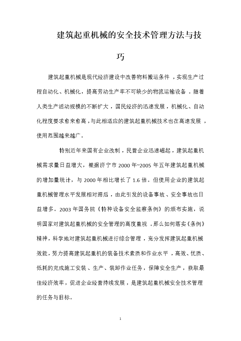 7建筑起重机械的安全技术管理方法与技巧建筑起重机械是现代经济建设中改善物料搬运条件实现生产过程自动化、机械化提高劳动生产率不可缺少的物流运输设备。随着人类生产活动规模的不断扩大国民经济的迅速发展机械化、自动化程度要求愈来愈高与此相适应的建筑起重机械技术也在高速发展使用范围越来越广。特别近年来国有企业改制民营企业迅速崛起建筑起重机械需求量日益增大根据济宁市2000年~2005年五年建筑起重机械的增加量统计与2000年相比增长了1.6倍。但使用企业的建筑起重机械管理水平发展相对滞后由此引发的设备事故、安全