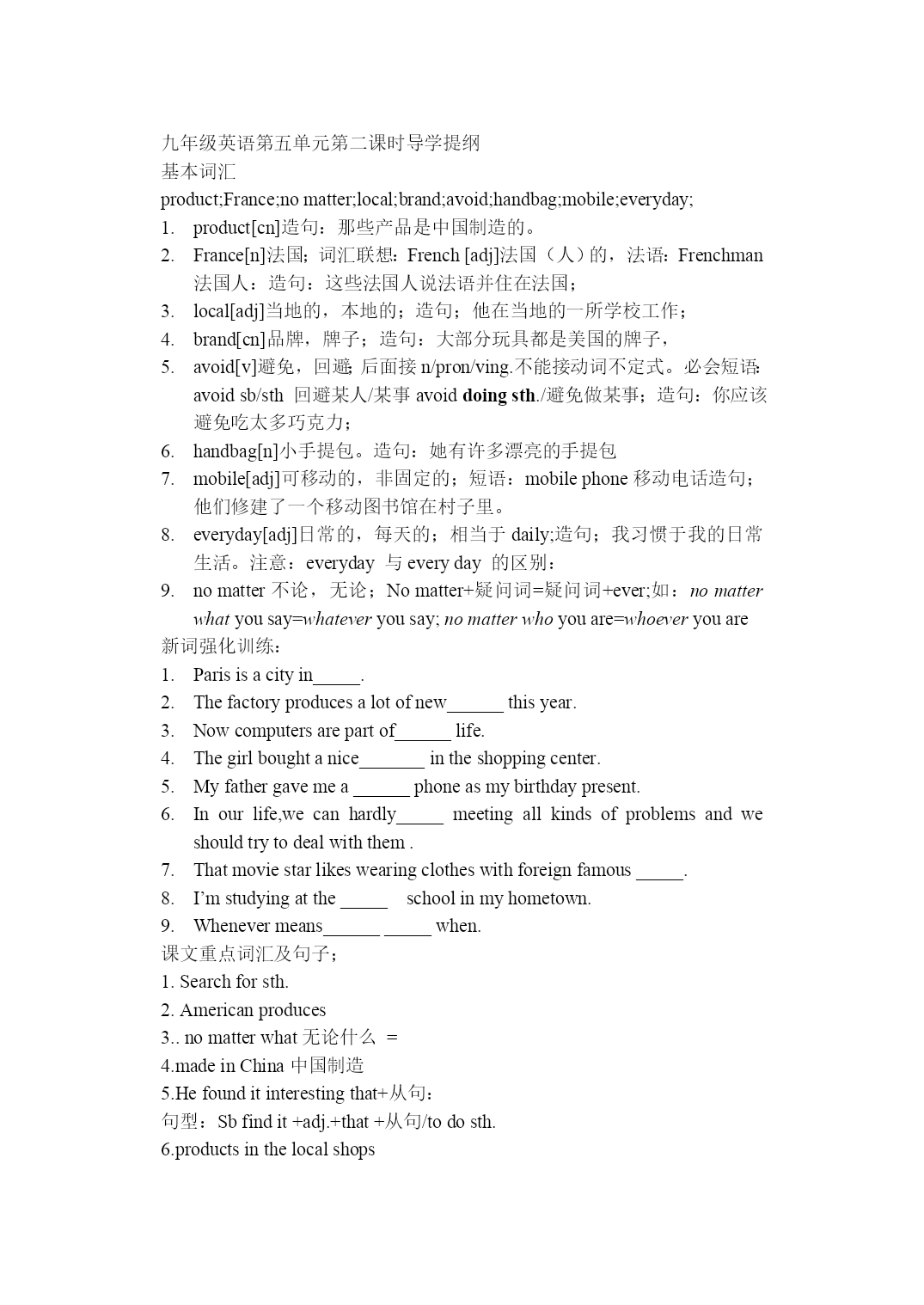 九年级英语第五单元第二课时导学提纲基本词汇product;France;nomatter;local;brand;avoid;handbag;mobile;everyday;product[cn]造句:那些产品是中国制造的。France[n]法国;词汇联想:French[adj]法国(人)的,法语:Frenchman法国人:造句:这些法国人说法语并住在法国;local[adj]当地的,本地的;造句;他在当地的一所学校工作;brand[cn]品牌,牌子;造句:大部分玩具都是美国的牌子,avoid[v]避免,