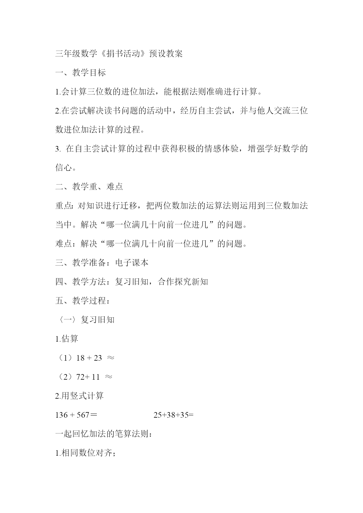 三年级数学《捐书活动》预设教案一、教学目标1.会计算三位数的进位加法,能根据法则准确进行计算。2.在尝试解决读书问题的活动中,经历自主尝试,并与他人交流三位数进位加法计算的过程。3.在自主尝试计算的过程中获得积极的情感体验,增强学好数学的信心。二、教学重、难点重点:对知识进行迁移,把两位数加法的运算法则运用到三位数加法当中。解决“哪一位满几十向前一位进几”的问题。难点:解决“哪一位满几十向前一位进几”的问题。三、教学准备:电子课本四、教学方法:复习旧知,合作探究新知五、教学过程:〈一〉复习旧知1.估算(1