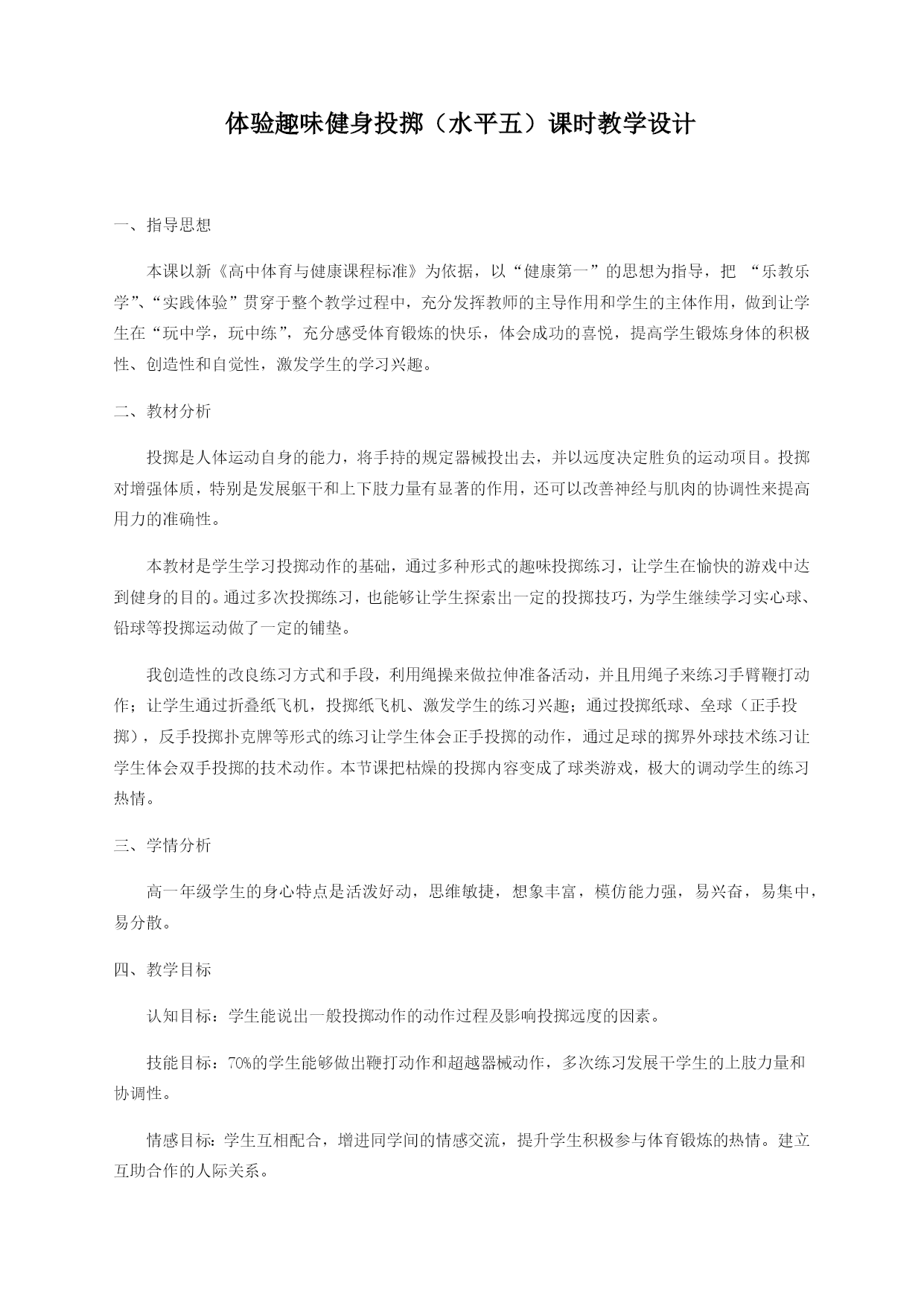 体验趣味健身投掷(水平五)课时教学设计一、指导思想本课以新《高中体育与健康课程标准》为依据,以“健康第一”的思想为指导,把“乐教乐学”、“实践体验”贯穿于整个教学过程中,充分发挥教师的主导作用和学生的主体作用,做到让学生在“玩中学,玩中练”,充分感受体育锻炼的快乐,体会成功的喜悦,提高学生锻炼身体的积极性、创造性和自觉性,激发学生的学习兴趣。二、教材分析投掷是人体运动自身的能力,将手持的规定器械投出去,并以远度决定胜负的运动项目。投掷对增强体质,特别是发展躯干和上下肢力量有显著的作用,还可以改善神经与肌肉