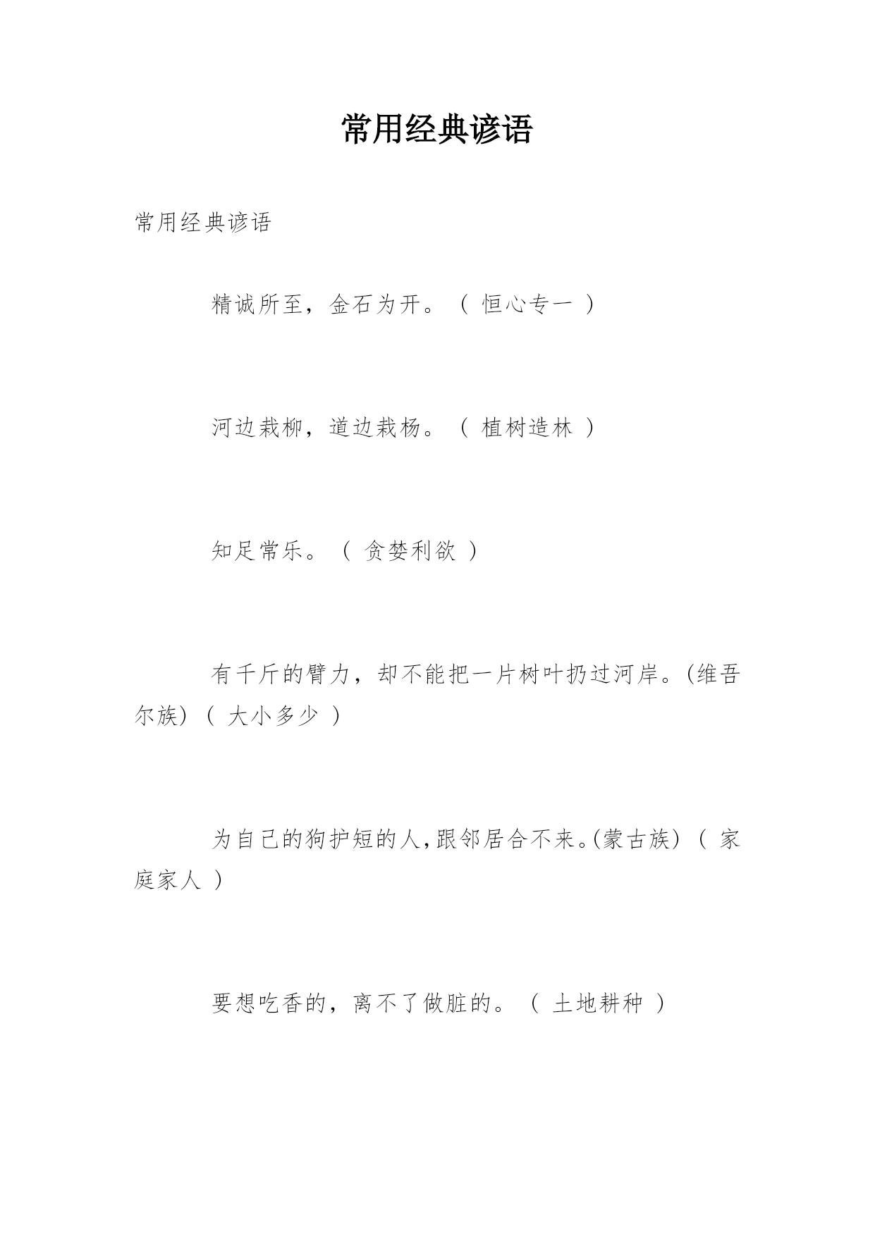 常用经典谚语常用经典谚语精诚所至,金石为开。(恒心专一)河边栽柳,道边栽杨。(植树造林)知足常乐。(贪婪利欲)有千斤的臂力,却不能把一片树叶扔过河岸。(维吾尔族)(大小多少)为自己的狗护短的人,跟邻居合不来。(蒙古族)(家庭家人)要想吃香的,离不了做脏的。(土地耕种)德行与技艺,是子孙最美的产业。(家庭家人)屙屎不出赖茅厕,寻食不到怪祖宗。(愚忧怒怨)采得百花成蜜后,为谁辛苦为谁甜。(贫穷富有)Pennywiseandpoundfoolish.小事聪明,大事糊涂。(英文谚语)无零不成帐。(因果条件)3li