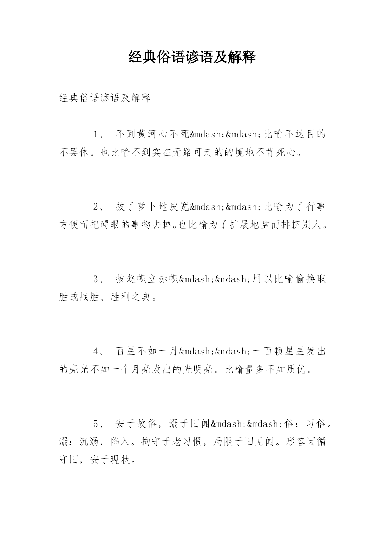 经典俗语谚语及解释经典俗语谚语及解释1、不到黄河心不死——比喻不达目的不罢休。也比喻不到实在无路可走的的境地不肯死心。2、拔了萝卜地皮宽——比喻为了行事方便而把碍眼的事物去掉。也比喻为了扩展地盘而排挤别人。3、拔赵帜立赤帜——用以比喻偷换取胜或战胜、胜利之典。4、百星不如一月——一百颗星星发出的亮光不如一个月亮发出的光明亮。比喻量多不如质优。5、安于故俗,溺于旧闻——俗:习俗。溺:沉溺,