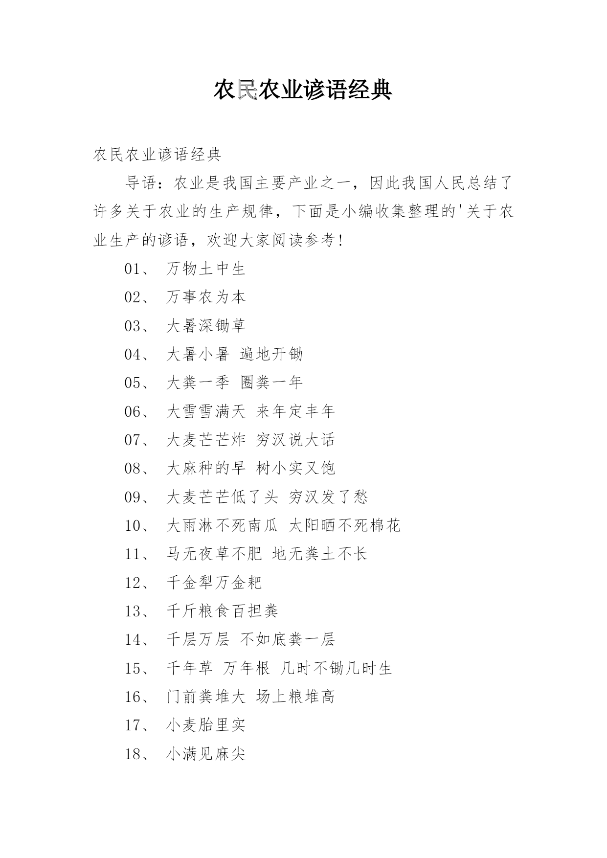 农民农业谚语经典农民农业谚语经典导语:农业是我国主要产业之一,因此我国人民总结了许多关于农业的生产规律,下面是小编收集整理的'关于农业生产的谚语,欢迎大家阅读参考!01、万物土中生02、万事农为本03、大暑深锄草04、大暑小暑遍地开锄05、大粪一季圈粪一年06、大雪雪满天来年定丰年07、大麦芒芒炸穷汉说大话08、大麻种的早树小实又饱09、大麦芒芒低了头穷汉发了愁10、大雨淋不死南瓜太阳晒不死棉花11、马无夜草不肥地无粪土不长12、千金犁万金耙13、千斤粮食百担粪14、千层万层不如底粪一层15、千年草万年根