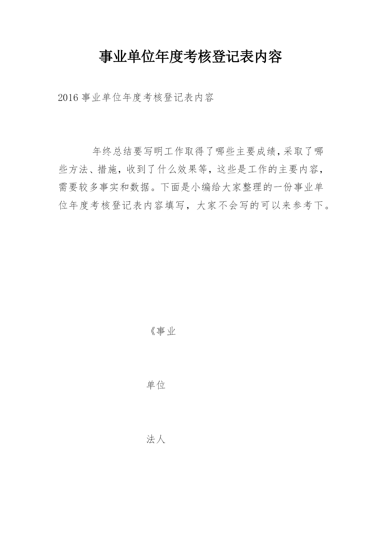 事业单位年度考核登记表内容2016事业单位年度考核登记表内容年终总结要写明工作取得了哪些主要成绩,采取了哪些方法、措施,收到了什么效果等,这些是工作的主要内容,需要较多事实和数据。下面是小编给大家整理的一份事业单位年度考核登记表内容填写,大家不会写的可以来参考下。《事业单位法人证书》登载事项单位名称库尔勒市中小企业信用担保中心宗旨和业务范围为中小企业和非公有制企业提供担保、贷款服务为企业提供担保、贷款住 所库尔勒市香梨大道国土大楼211室法定代表人邢德江开办资金1357.