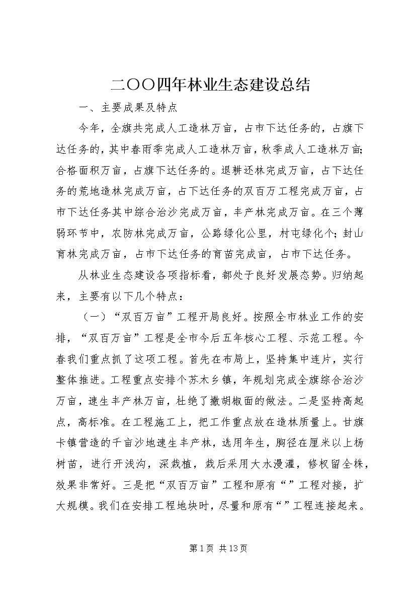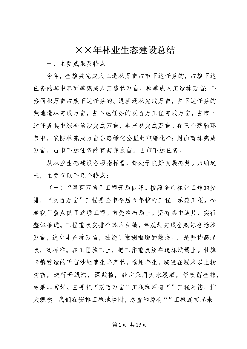 ××年林业生态建设总结一、主要成果及特点今年全旗共完成人工造林万亩占市下达任务的占旗下达任务的其中春雨季完成人工造林万亩秋季成人工造林万亩;合格面积万亩占旗下达任务的。退耕还林完成万亩占下达任务的荒地造林完成万亩占下达任务的双百万工程完成万亩占市下达任务其中综合治沙完成万亩丰产林完成万亩。在三个薄弱环节中农防林完成万亩公路绿化公里村屯绿化个;封山育林完成万亩占市下达任务的育苗完成亩占市下达任务。从林业生态建设各项指标看都处于良好发展态势。归纳起来主要有以下几个
