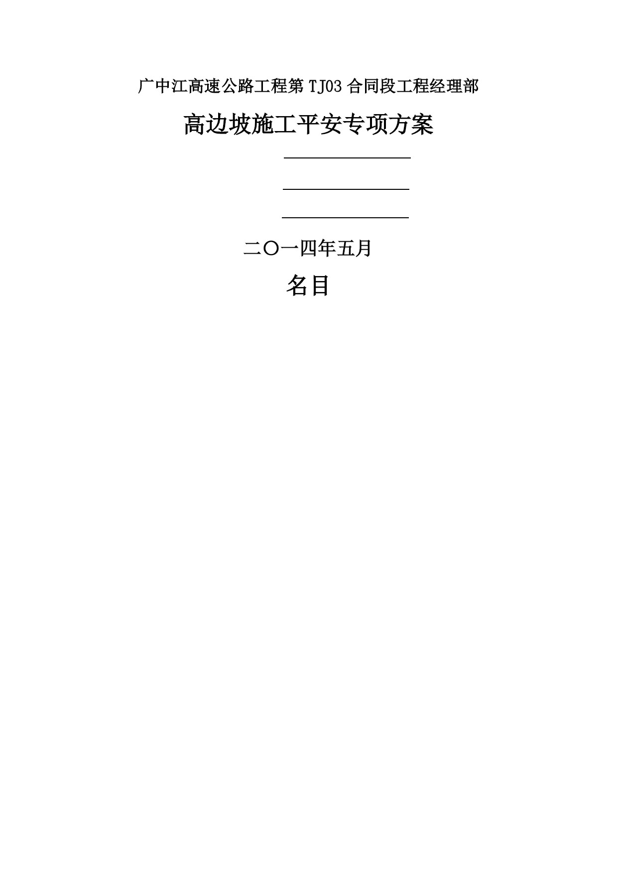 广中江高速公路项目第TJ03合同段项目经理部高边坡施工安全专项方案编制:审核:批准:二〇一四年五月目录第一章编制说明11.1编制依据11.2编制目的11.3安全目标11.4适用范围1第二章工程概况22.1工程概况22.2地形地貌22.3气候条件32.4施工环境3第三章组织机构及职责43.1安全生产领导小组43.2领导小组分工及职责4第四章施工工艺及方法54