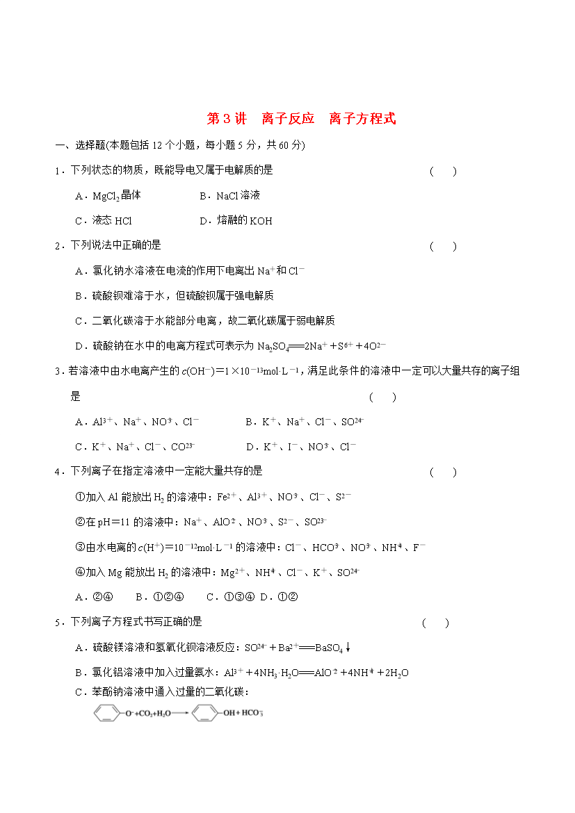 第3讲离子反应离子方程式一、选择题(本题包括12个小题每小题5分共60分)1.下列状态的物质既能导电又属于电解质的是()A.MgCl2晶体B.NaCl溶液C.液态HClD.熔融的KOH2.下列说法中正确的是()A.氯化钠水溶液在电流的作用下电离出Na+和Cl-B.硫酸钡难溶于水但硫酸钡属于强电解质C.二氧化碳溶于水能部分电离故二氧化碳属于弱电解质D.硫酸钠在水中的电离方程式可表示为Na2SO4===2Na++S6++4O2-3.若溶液中由水电离产生的c(OH-)=1×10-1