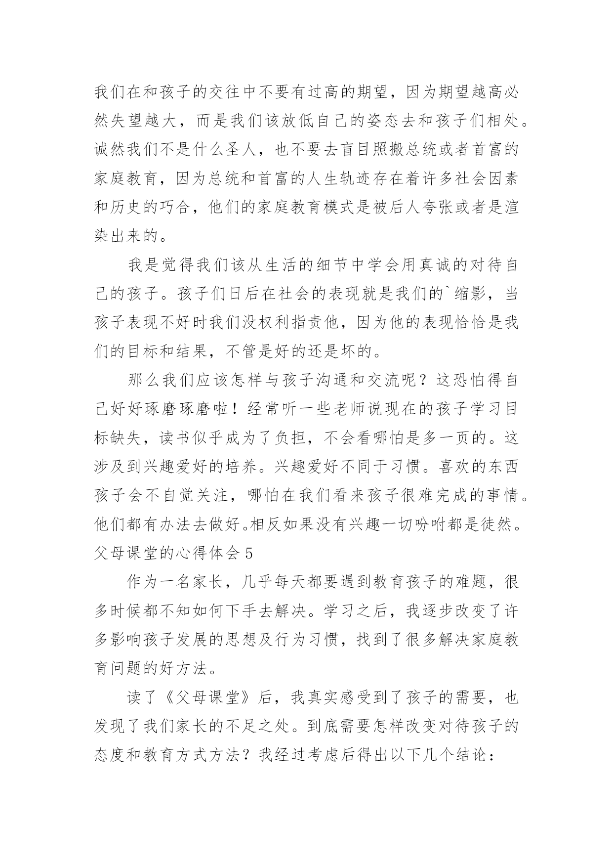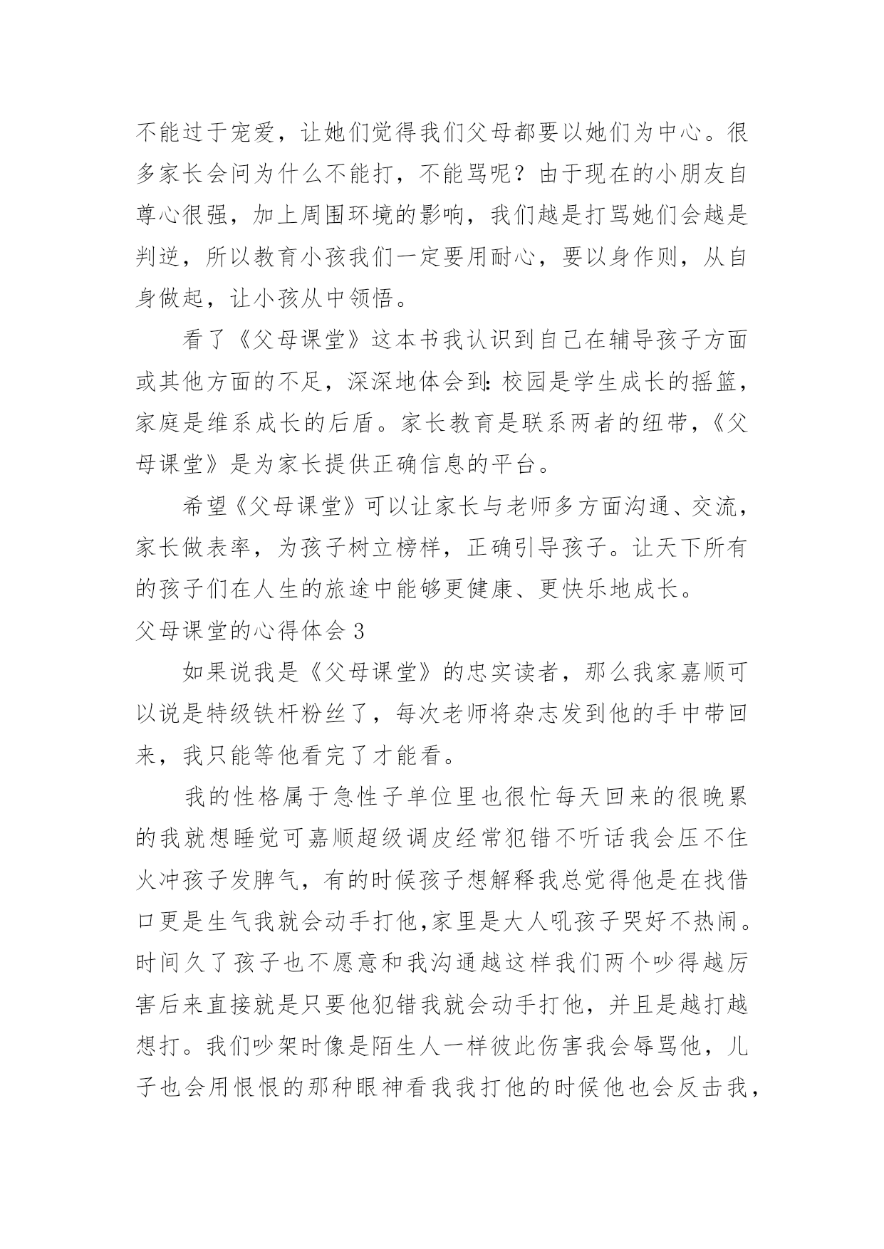《父母课堂》心得体会《父母课堂》心得体会20篇当我们有一些感想时,常常可以将它们写成20篇心得体会,这么做可以让我们不断思考不断进步。你想好怎么写心得体会了吗?以下是小编为大家收集的《父母课堂》心得体会,仅供参考,希望能够帮助到大家。《父母课堂》心得体会1作为一名家长,几乎每天都要遇到教育孩子的难题,很多时候都不知如何下手去解决。学习之后,我逐步改变了许多影响孩子发展的思想及行为习惯,找到了很多解决家庭教育问题的好方法。读了《父母课堂》后,我真实感受到了孩子的需要,也发现了我们家长的不足之处。到底需要怎样