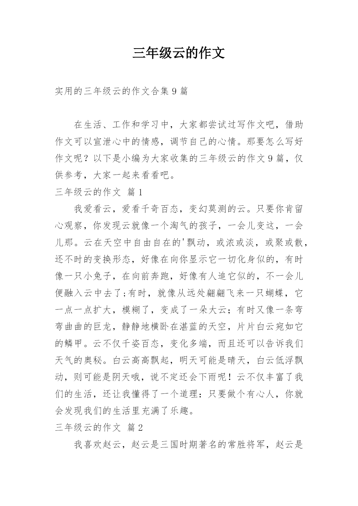 三年级云的作文实用的三年级云的作文合集9篇在生活、工作和学习中,大家都尝试过写作文吧,借助作文可以宣泄心中的情感,调节自己的心情。那要怎么写好作文呢?以下是小编为大家收集的三年级云的作文9篇,仅供参考,大家一起来看看吧。三年级云的作文篇1我爱看云,爱看千奇百态,变幻莫测的云。只要你肯留心观察,你发现云就像一个淘气的孩子,一会儿变这,一会儿那。云在天空中自由自在的'飘动,或浓或淡,或聚或散,还不时的变换形态,好像在向你显示它一切化身似的,有时像一只小兔子,在向前奔跑,好像有人追它似的,不一会儿便融入云中去了