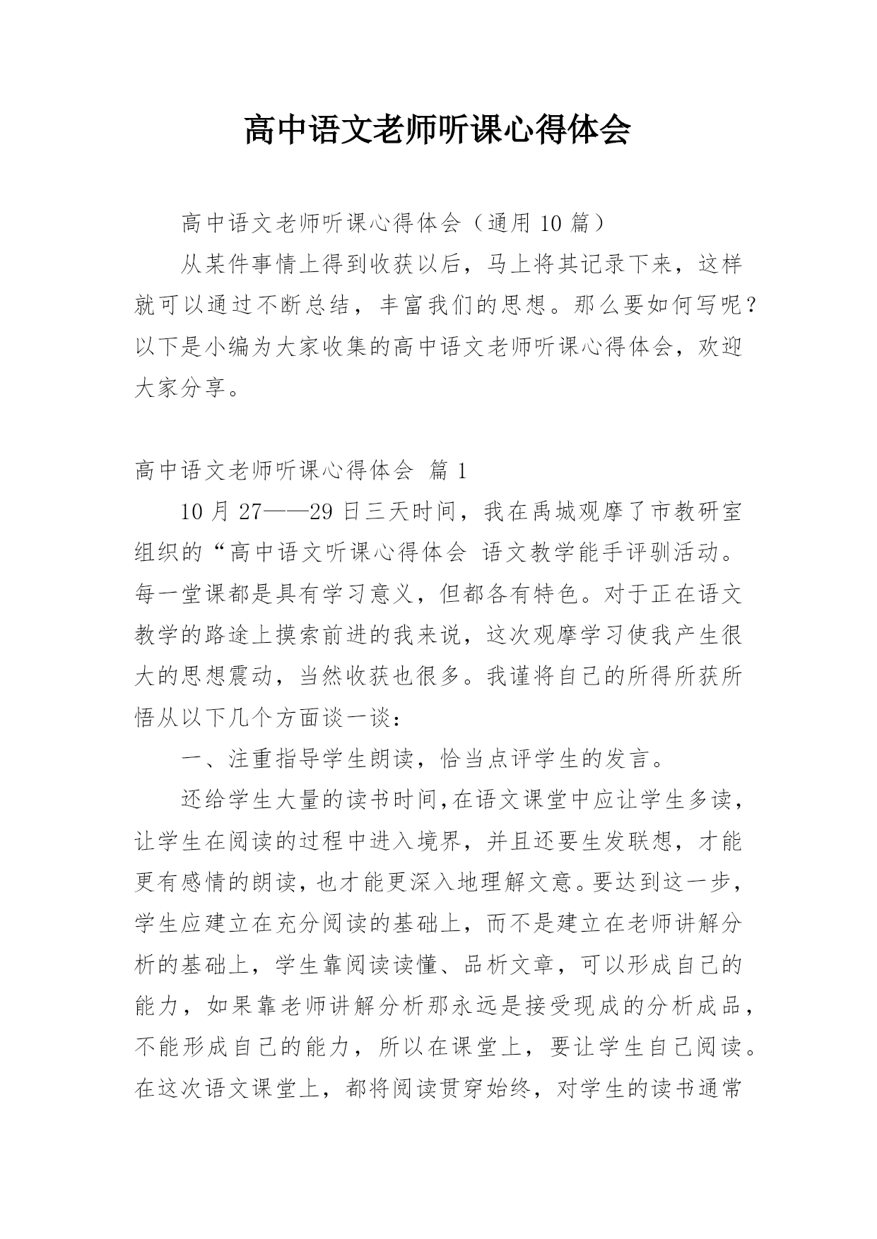 此资料由网络收集而来,如有侵权请告知上传者立即删除。资料共分享,我们负责传递知识。20XX年高中语文老师听课心得体会听课是推进课堂教学、提高课堂效率的有力手段,有效开展活动对于提升语文教学整体水平、打造业务精湛的教师队伍具有重要意义。下面是有20xx高中语文老师听课心得体会,欢迎参阅。20xx高中语文老师听课心得体会范文110月27——29日三天时间,我在禹城观摩了市教研室组织的“高中语文听课心得体会语文教学能手评驯活动。每一堂课都是具有学习意义,但都各有特色。对于正在语文教