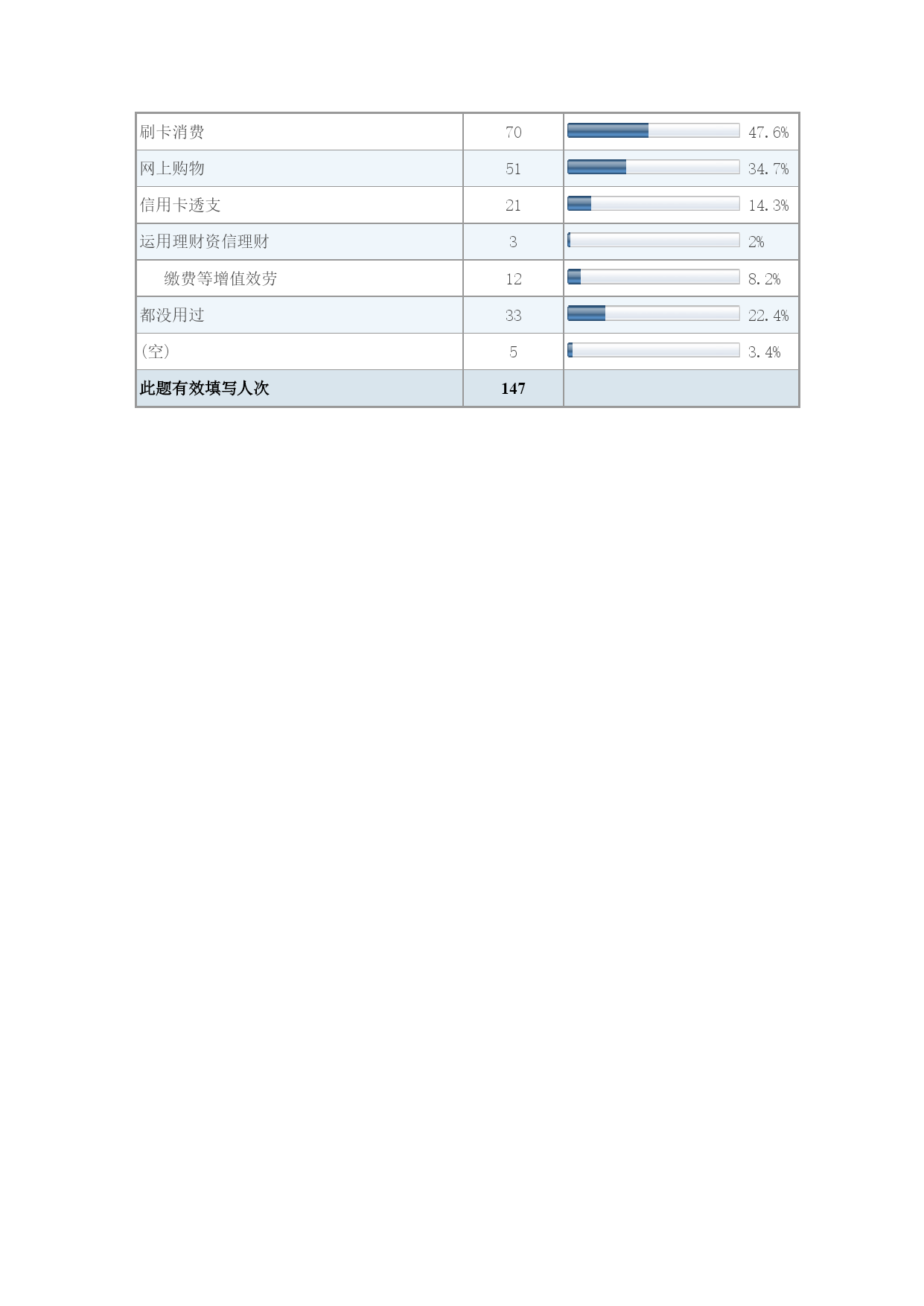 信用卡使用情况调查报告据调查显示,2xxx年,中国信用卡发行量约为300万张。而到2006年底,达到5000万张,即使在金融危机影响下的2008年,也已经达到近1.3亿张。截止2009年12月,我国信用卡发行量已经突破3亿。信用卡市场将是一个十分具有前景的潜力市场。当前,中国人的信用卡使用主要有以下五个特点。首先,信用卡的消费群体主要是青年人。61.5%的信用卡用户处在25岁到34岁之间,且主要以本科生与研究生为主。第二,信用卡消费金额普遍在3000元以内。据调查显示,74.6%的信用卡用户月均信用卡消费