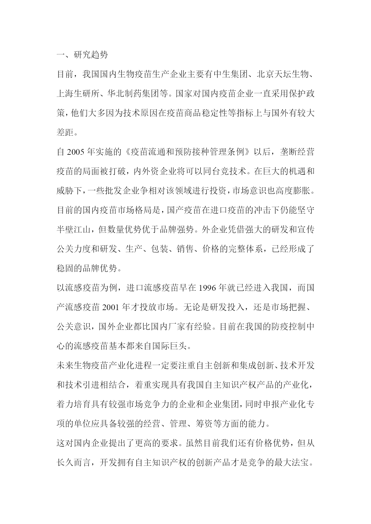 一、研究趋势目前,我国国内生物疫苗生产企业主要有中生集团、北京天坛生物、上海生研所、华北制药集团等。国家对国内疫苗企业一直采用保护政策,他们大多因为技术原因在疫苗商品稳定性等指标上与国外有较大差距。自2005年实施的《疫苗流通和预防接种管理条例》以后,垄断经营疫苗的局面被打破,内外资企业将可以同台竞技术。在巨大的机遇和威胁下,一些批发企业争相对该领域进行投资,市场意识也高度膨胀。目前的国内疫苗市场格局是,国产疫苗在进口疫苗的冲击下仍能坚守半壁江山,但数量优势优于品牌强势。外企业凭借强大的研发和宣传公关力度
