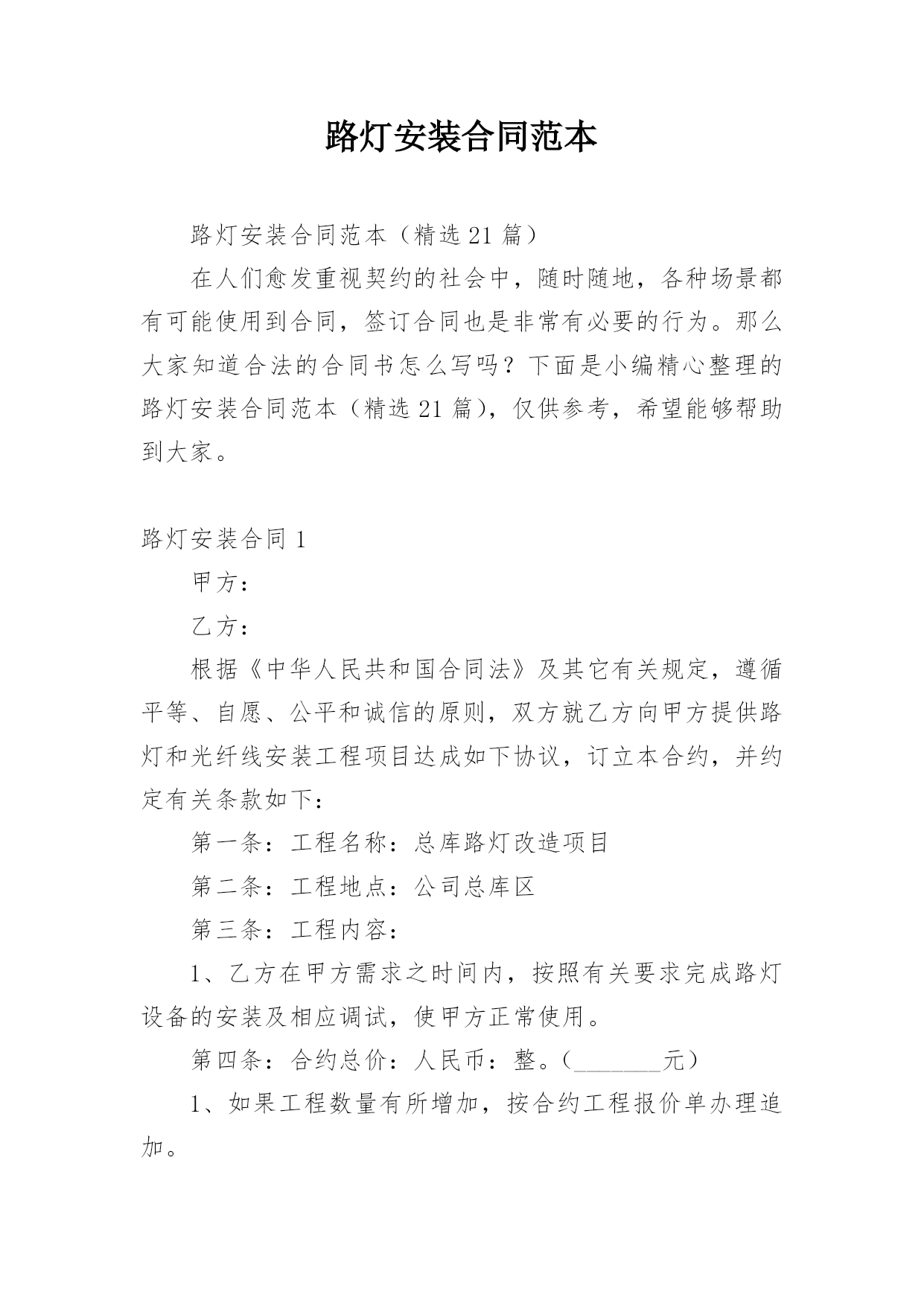 路灯安装合同范本路灯安装合同范本路灯安装合同范本(精选21篇)在人们愈发重视契约的社会中,随时随地,各种场景都有可能使用到合同,签订合同也是非常有必要的行为。那么大家知道合法的合同书怎么写吗?下面是小编精心整理的路灯安装合同范本(精选21篇),仅供参考,希望能够帮助到大家。路灯安装合同1甲方:乙方:根据《中华人民共和国合同法》及其它有关规定,遵循平等、自愿、公平和诚信的原则,双方就乙方向甲方提供路灯和光纤线安装工程项目达成如下协议,订立本合约,并约定有关条款如下:第一条:工程名称:总库路灯改造项目第二条: