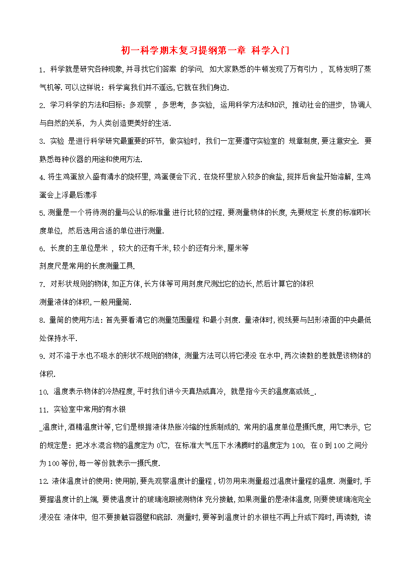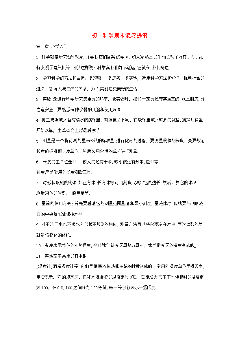 初一科学期末复习提纲第一章科学入门1.科学就是研究各种现象并寻找它们答案的学问.如大家熟悉的牛顿发现了万有引力瓦特发明了蒸气机等.可以这样说:科学离我们并不遥远它就在我们身边.2.学习科学的方法和目标:多观察多思考多实验运用科学方法和知识推动社会的进步协调人与自然的关系为人类创造更美好的生活.3.实验是进行科学研究最重要的环节做实验时我们一定要遵守实验室的规章制度要注意安全.要熟悉每种仪器的用途和使用方法.4.将生鸡蛋放入盛有清水的烧杯里鸡蛋便会下沉