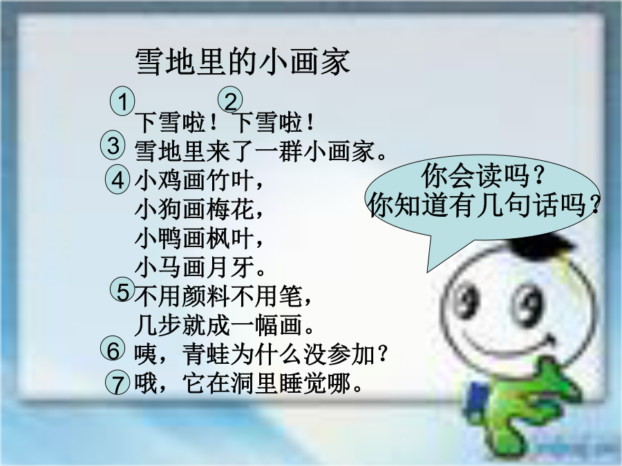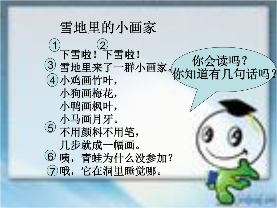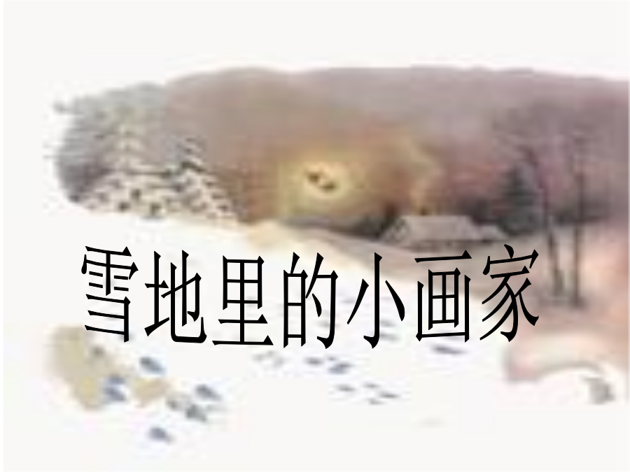 复习生字,导入新课冬天来了...自读课文,读准字音下雪啦,下雪啦!雪地里来了一群小画家。小鸡画竹叶,小狗画梅花,小鸭画枫叶,小马画月牙。不用颜料不用笔,几步就成一幅画。青蛙为什么没参加?它在洞里睡着啦!下雪啦,下雪啦!雪地里来了一群小画家。小鸡画小狗画小鸭画小马画说一说小鸡的脚印像()。小狗的脚印像()。小鸭的脚印像()。小马的脚印像()。为什么青蛙没参加?熊谢谢观赏!