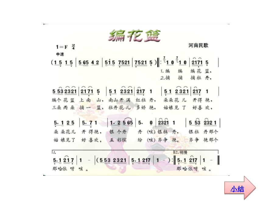 河南民歌河南不但有如此有名的、有特色的戏剧,河南的洛阳还被誉为牡丹之乡。你们可知牡丹被喻为我国的什么吗?国花,牡丹号称国色天香,是花中之王。而河南洛阳的牡丹更是雍容华贵、艳而不俗、娇而不媚,相当的漂亮。这光说啊太虚了,正所谓眼见为实。观赏下这些牡丹花漂亮吗?正是因为牡丹花如此的美丽、漂亮。所以河南人们也多了一项娱乐活动,编个花篮去摘牡丹。编花篮河南民歌可以分为三类:号子、山歌和小调。那么这个《编花篮》是属于哪一类呢?我们来跟着伴奏默唱一遍。今天就到这再见