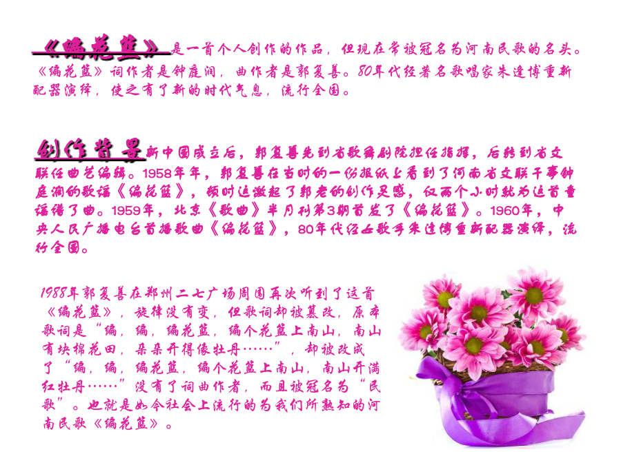 第一课编花篮小结《编花篮》是一首个人创作的作品,但现在常被冠名为河南民歌的名头。《编花篮》词作者是钟庭润,曲作者是郭复善。80年代经著名歌唱家朱逢博重新配器演绎,使之有了新的时代气息,流行全国。什么是民歌?学唱课堂总结