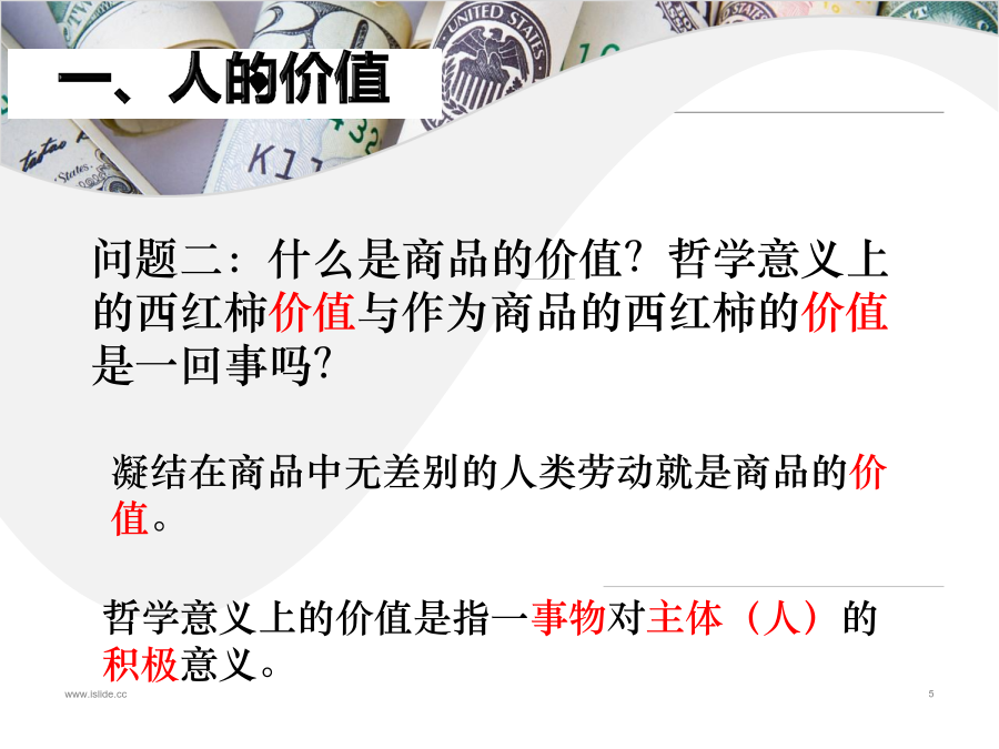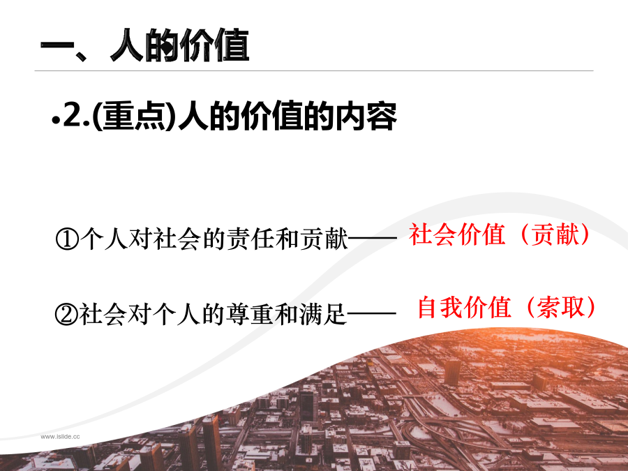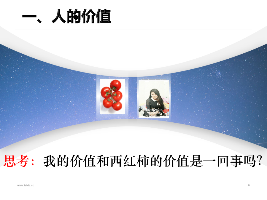 价值与价值观1.(难点内容)哲学意义上的价值的含义www.islide.ccwww.islide.ccwww.islide.cc物的价值感动中国感动你我www.islide.ccwww.islide.ccwww.islide.ccwww.islide.cc结论二:价值观是人生的重要向导(1)价值观对人们认识和改造世界的活动有重要的导向作用。(2)价值观是人生的重要向导。www.islide.cc价值与价值观