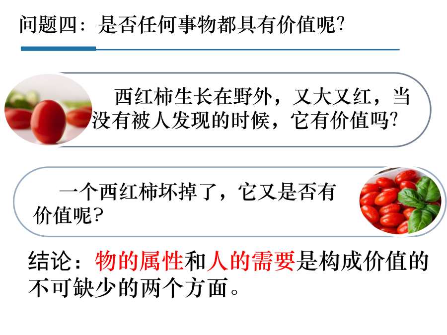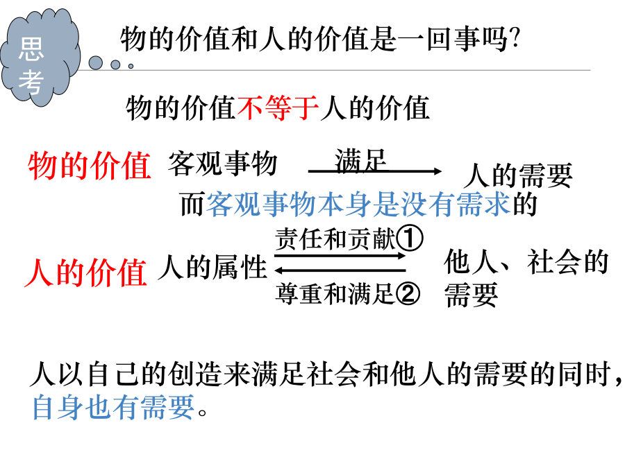 创造价值、承担使命广州市第九十七中学:陈湘坚情景探究1:荒岛求生一、价值与价值观物的价值思考:我们评价一个人的价值大小,标准是什么?价值价值观情景探究3:最美家书②价值观对人生道路的选择有导向作用微电影《新时代的时传祥》中的掏粪工李学玲和时传祥的事迹体现了社会主义核心价值观中哪个方面?是如何体现的?你从他们身上学会了什么?敬业