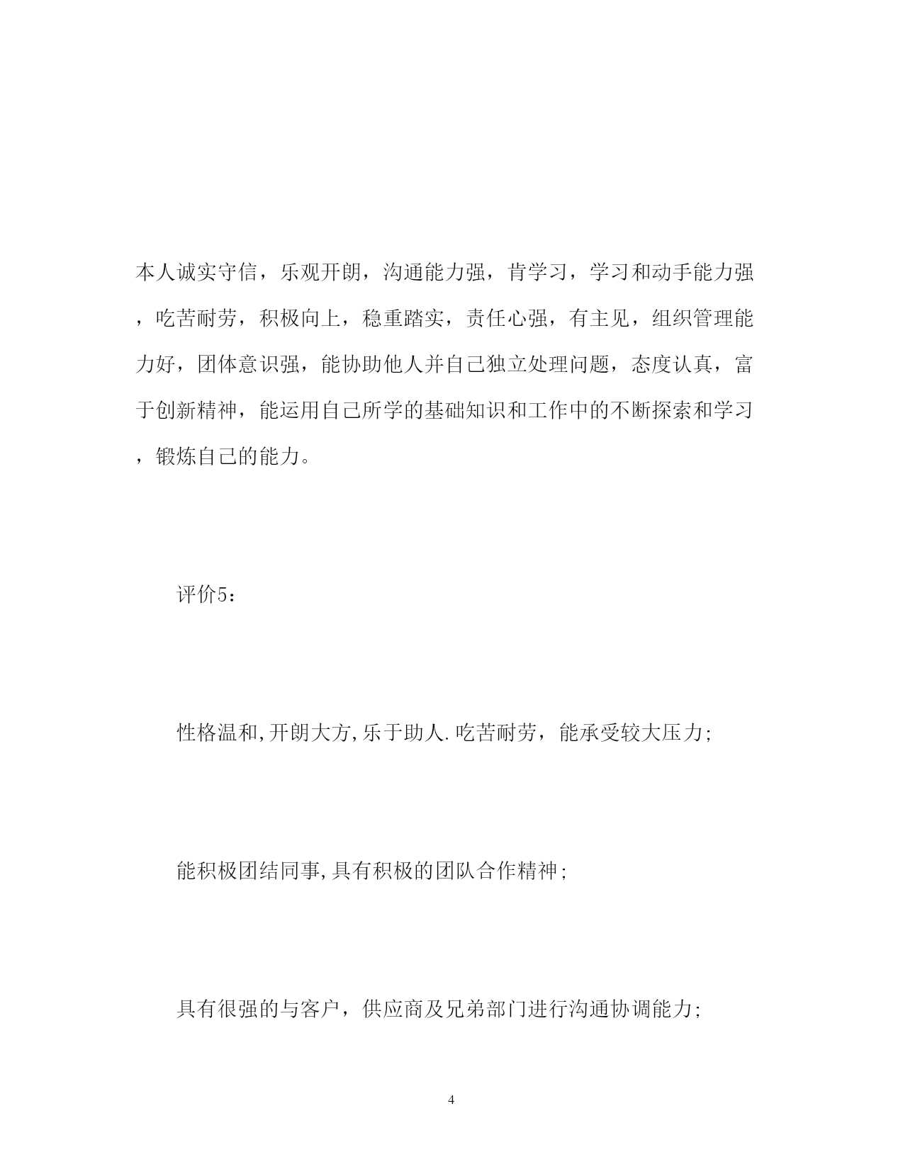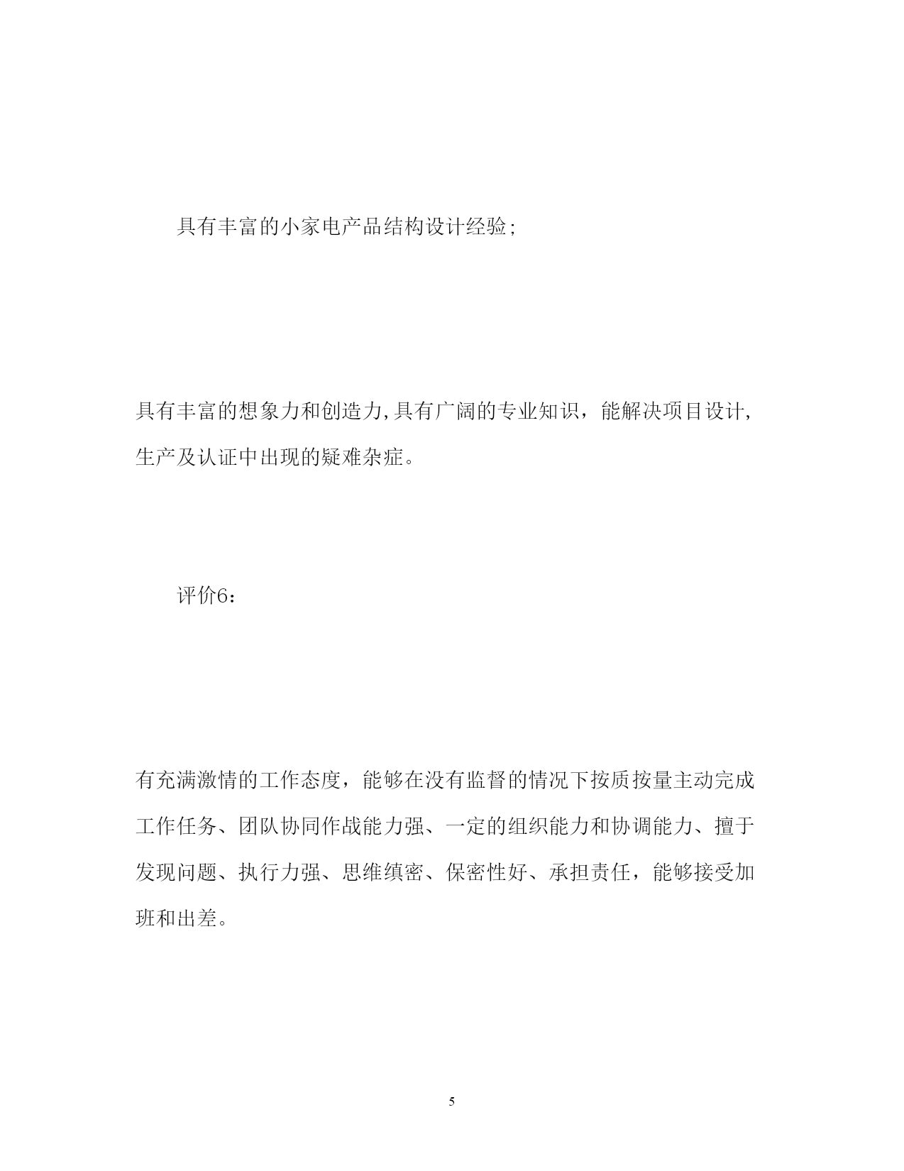 此资料由网络收集而来,如有侵权请告知上传者立即删除。资料共分享,我们负责传递知识。工作简历自我评价工作简历自我评价评价1:专业知识扎实,有积极的工作态度,能够独立工作,又极赋团队精神,同时具有良好的文化素质;赋有进取心,有良好的人员管理和沟通协调能力。对待工作认真负责,善于沟通、协调有较强的组织能力与团队精神;活泼开朗、乐观上进、有爱心并善于施教并行;上进心强、勤于学习能不断提高自身的能力与综合素质。在未来的工作中,我将以充沛的精力,刻苦钻研的精神来努力工作,稳定地提高自己的