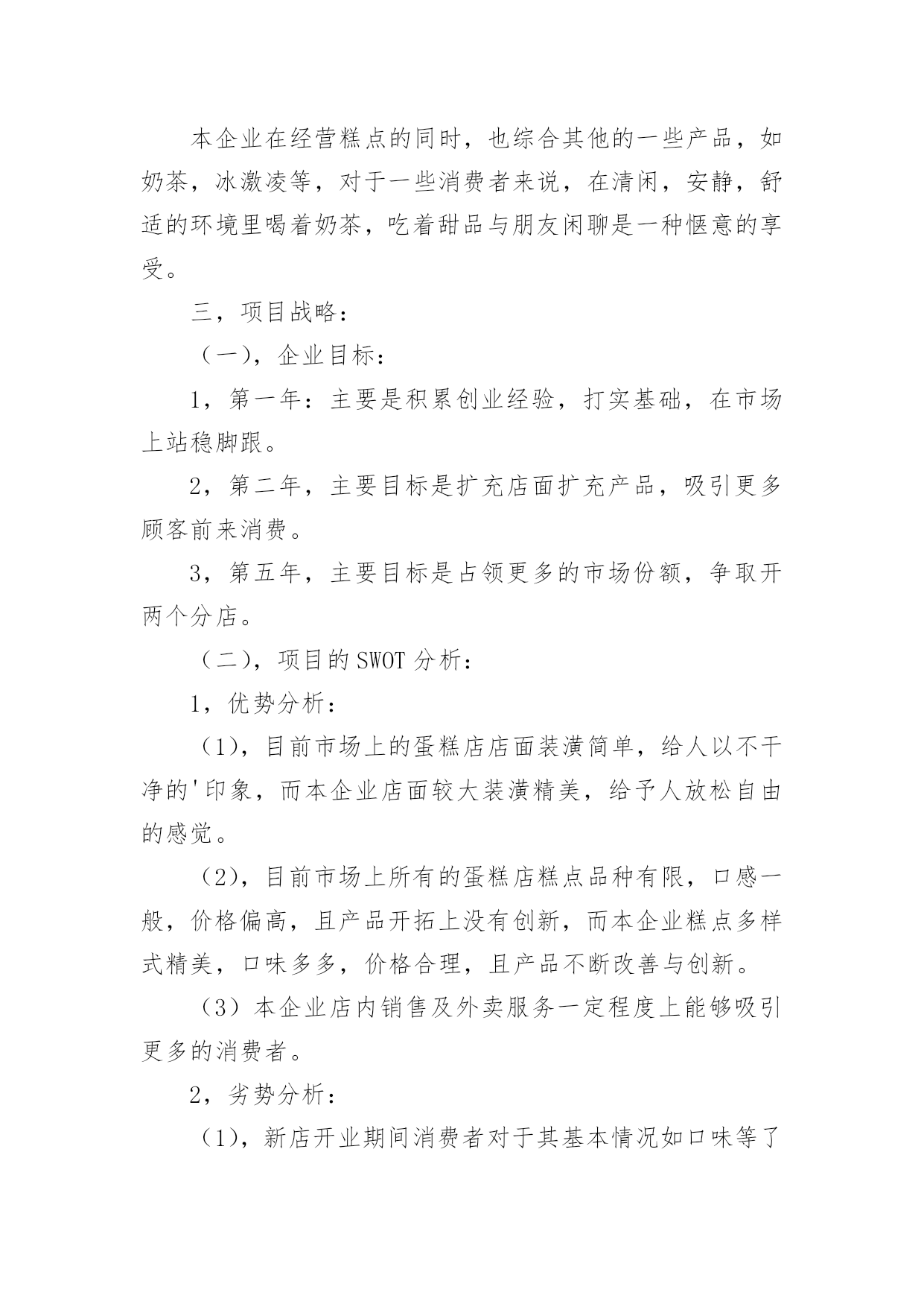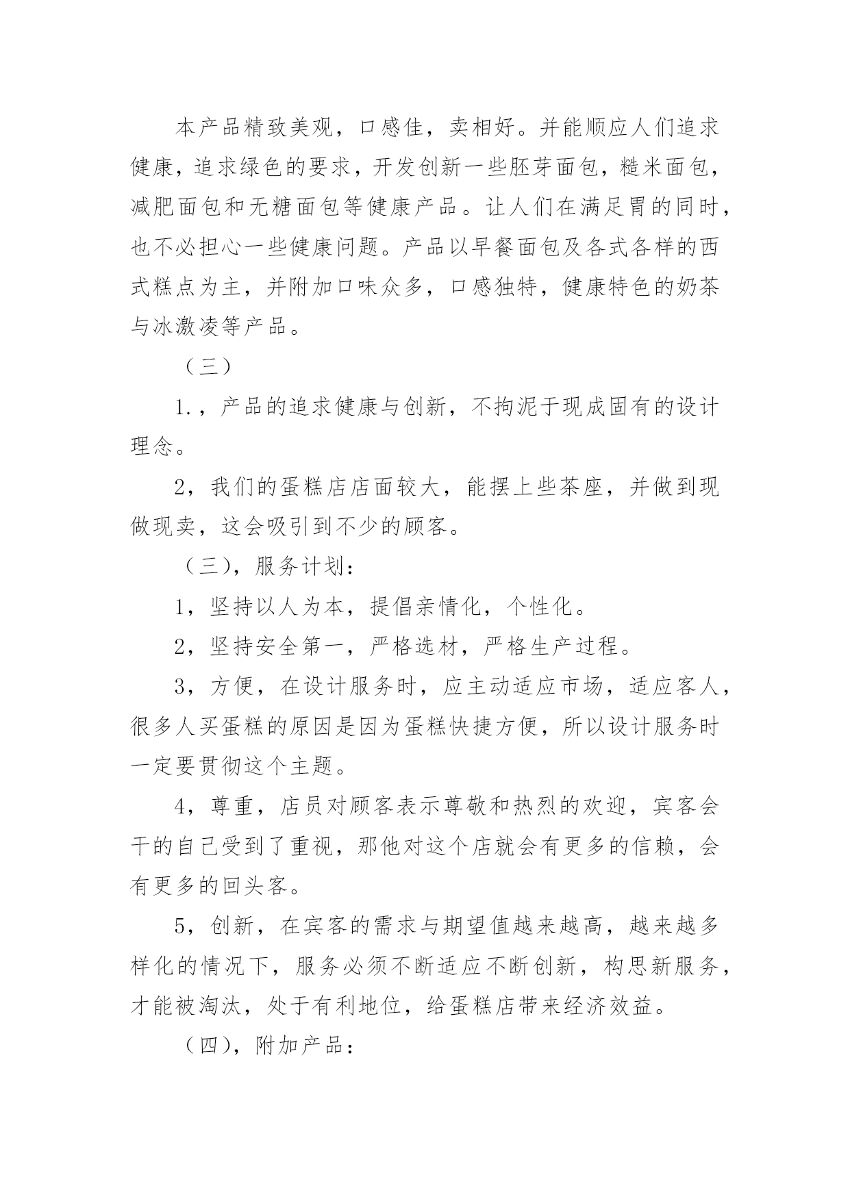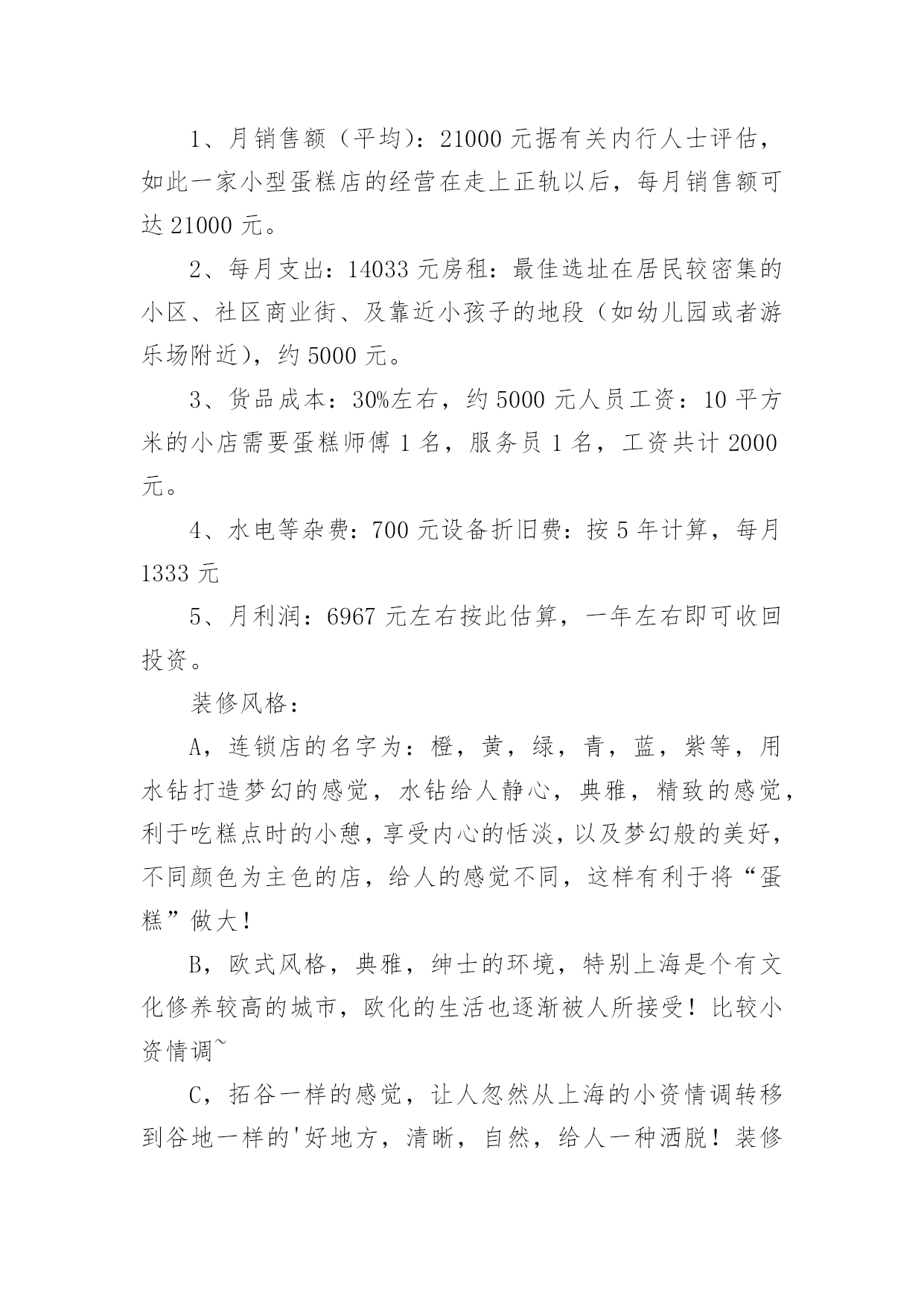 蛋糕店创业计划书蛋糕店创业计划书[范例15篇]人生天地之间,若白驹过隙,忽然而已,我们的工作又进入新的阶段,为了在工作中有更好的成长,写一份计划,为接下来的工作做准备吧!你所接触过的计划都是什么样子的呢?以下是小编为大家收集的蛋糕店创业计划书,仅供参考,欢迎大家阅读。蛋糕店创业计划书1一、执行总结随着社会的发展进步,生活水平不断提高,对于生活的要求也成不断上升趋势.在中国各大城市的西餐/烘焙行业,也随之发展并占有一席之地,有着空前的市场发展空间,这个几千年的西方饮食文化以迅雷不及掩耳的速度登陆了中国市场.