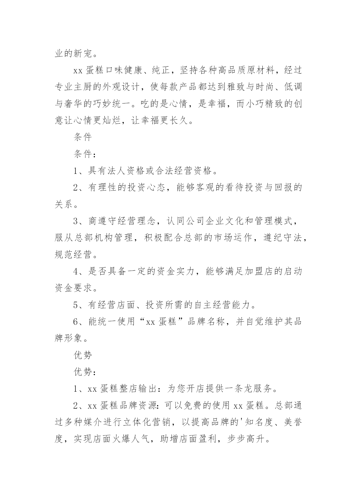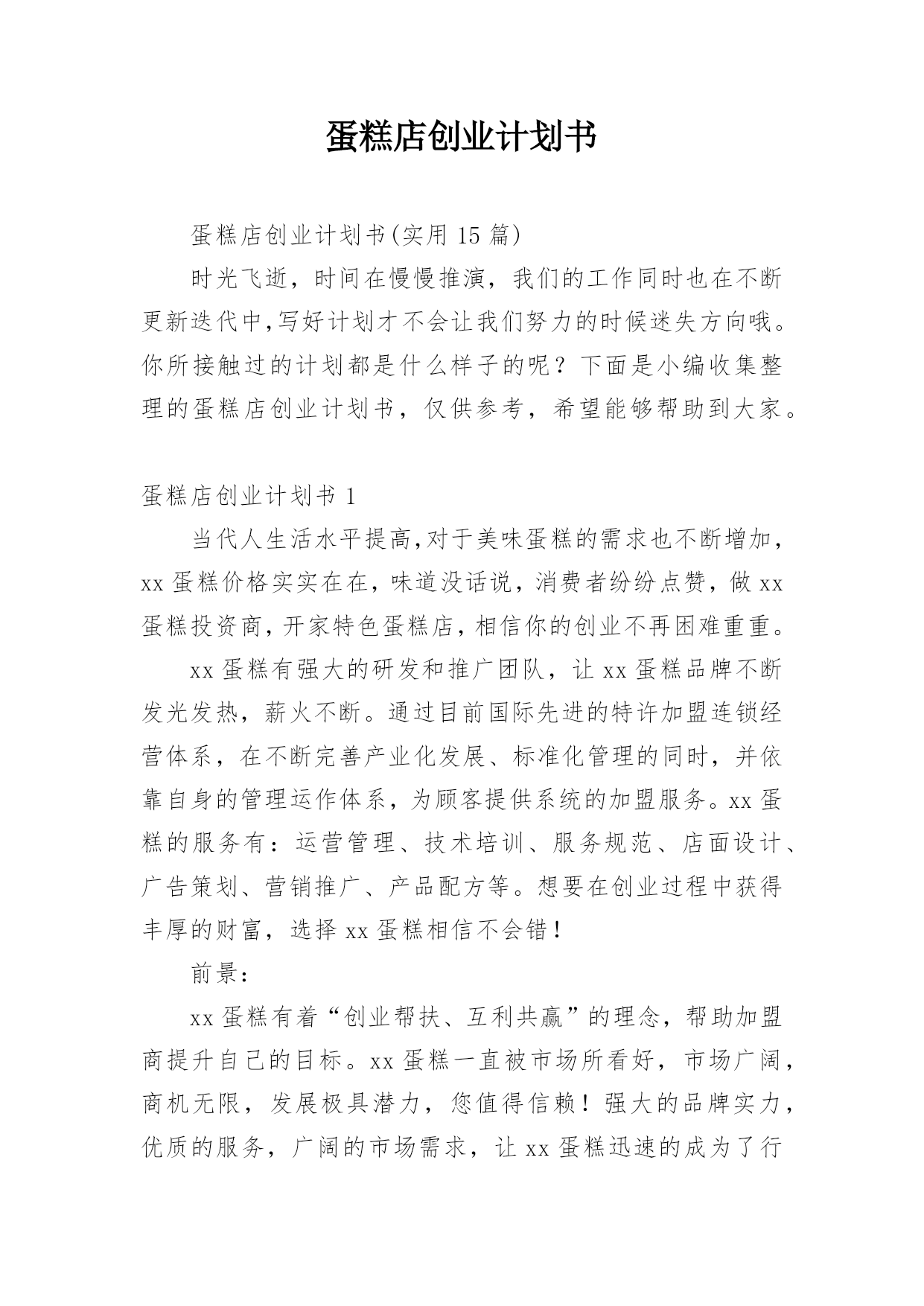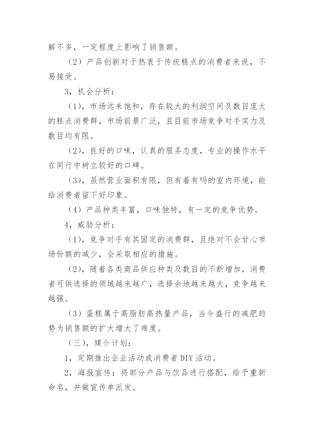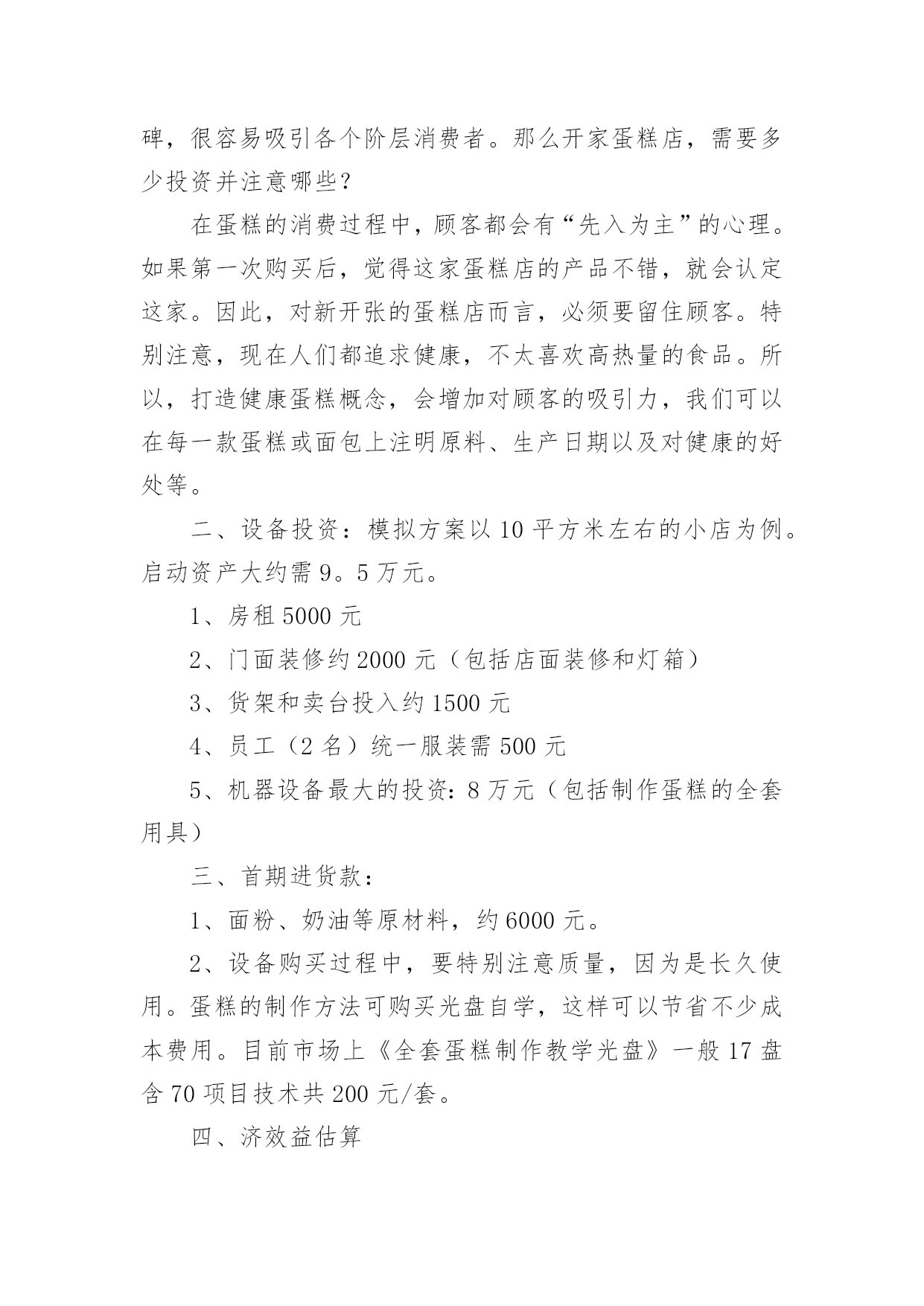 蛋糕店创业计划书蛋糕店创业计划书[范例15篇]人生天地之间,若白驹过隙,忽然而已,我们的工作又进入新的阶段,为了在工作中有更好的成长,写一份计划,为接下来的工作做准备吧!你所接触过的计划都是什么样子的呢?以下是小编为大家收集的蛋糕店创业计划书,仅供参考,欢迎大家阅读。蛋糕店创业计划书1一、执行总结随着社会的发展进步,生活水平不断提高,对于生活的要求也成不断上升趋势.在中国各大城市的西餐/烘焙行业,也随之发展并占有一席之地,有着空前的市场发展空间,这个几千年的西方饮食文化以迅雷不及掩耳的速度登陆了中国市场.